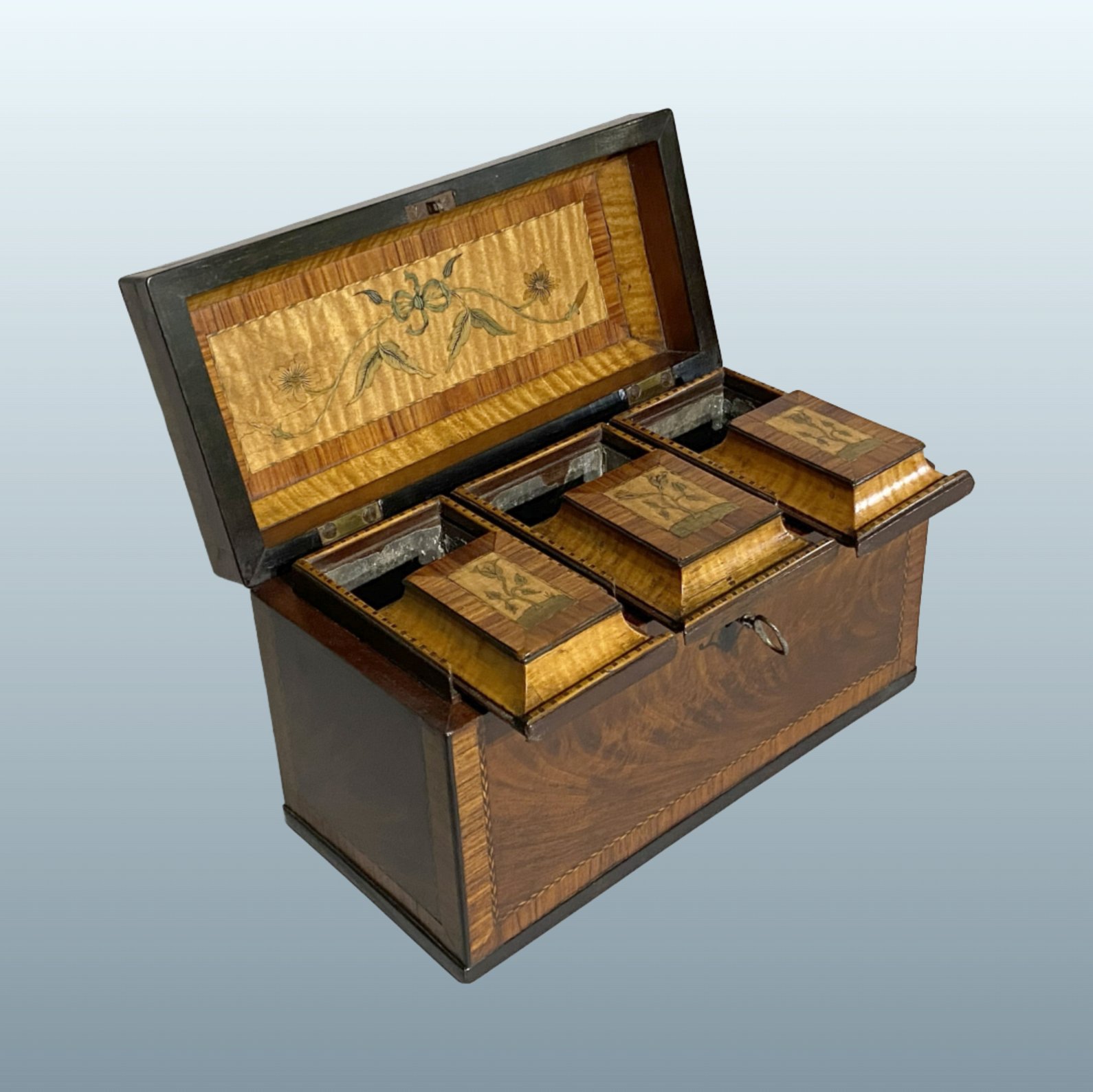 A Fine Mahogany and Satinwood Triple Tea Caddy, English, circa 1790.