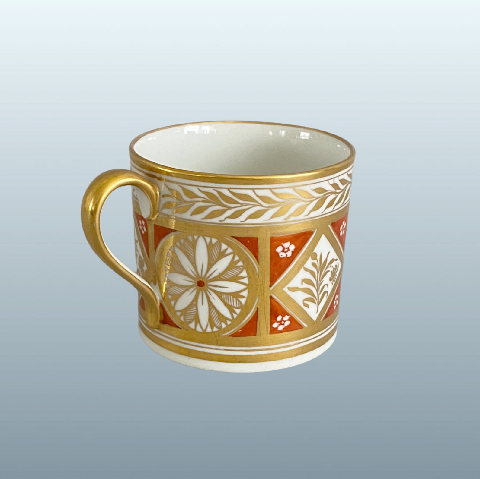 A finely decorated coffee can featuring gilt bands and an upper foliate wreath. The body is set against a wide orange ground, accented with an alternating gilt circle and diamond geometric pattern.
