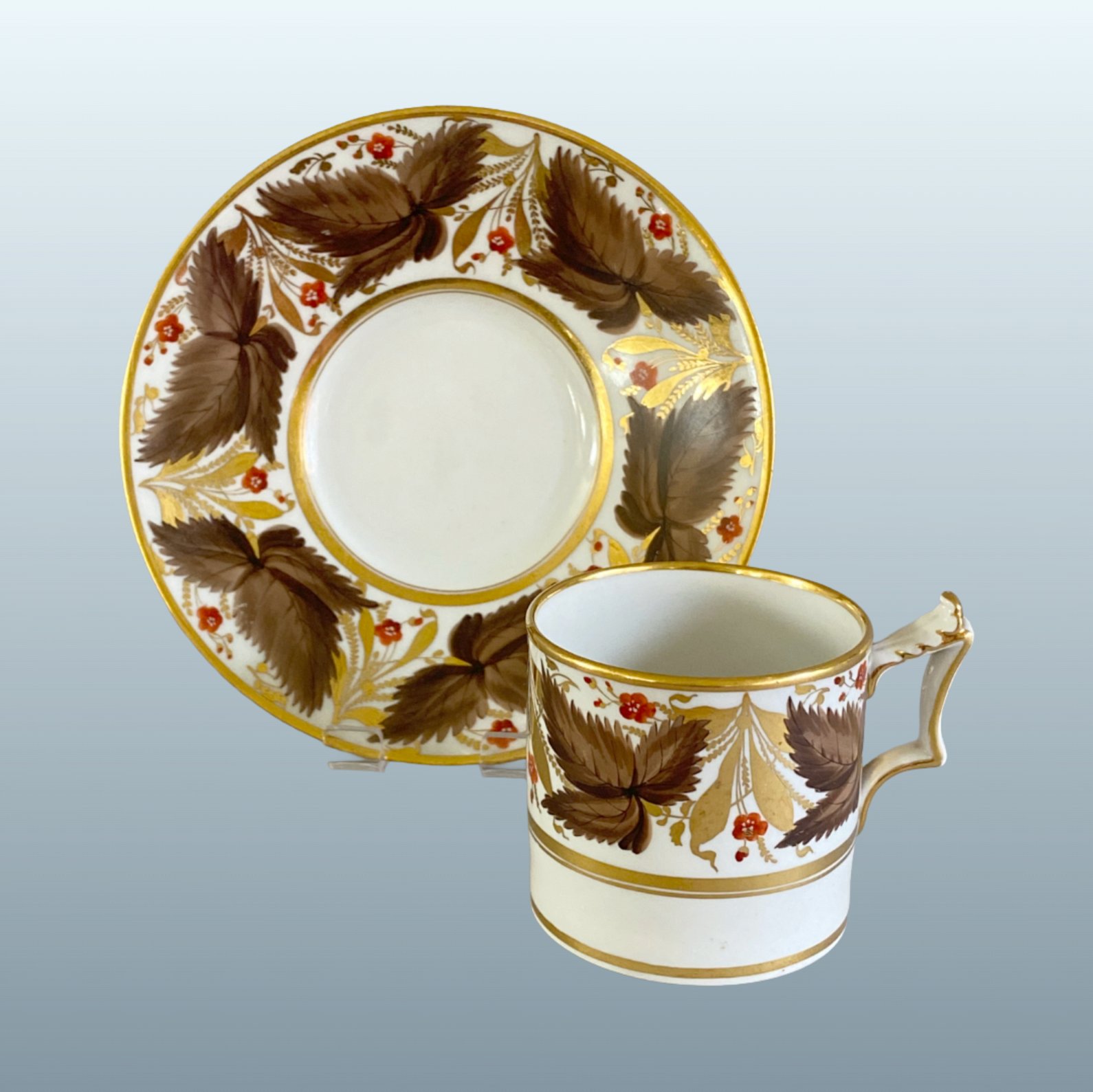 AN EARLY 19TH CENTURY FLIGHT BARR & BARR WORCESTER PORCELAIN CAN AND SAUCER, CIRCA 1820 Porcelain, enamel, and gilt decoration. Each piece is decorated with a wide band of stylised leaves interlaced with gilded fronds, highlighted by gilt bands and vibrant orange flower heads. The balanced combination of colour and gilding reflects the refined decorative taste of the Regency period. Impressed FBB mark underneath.