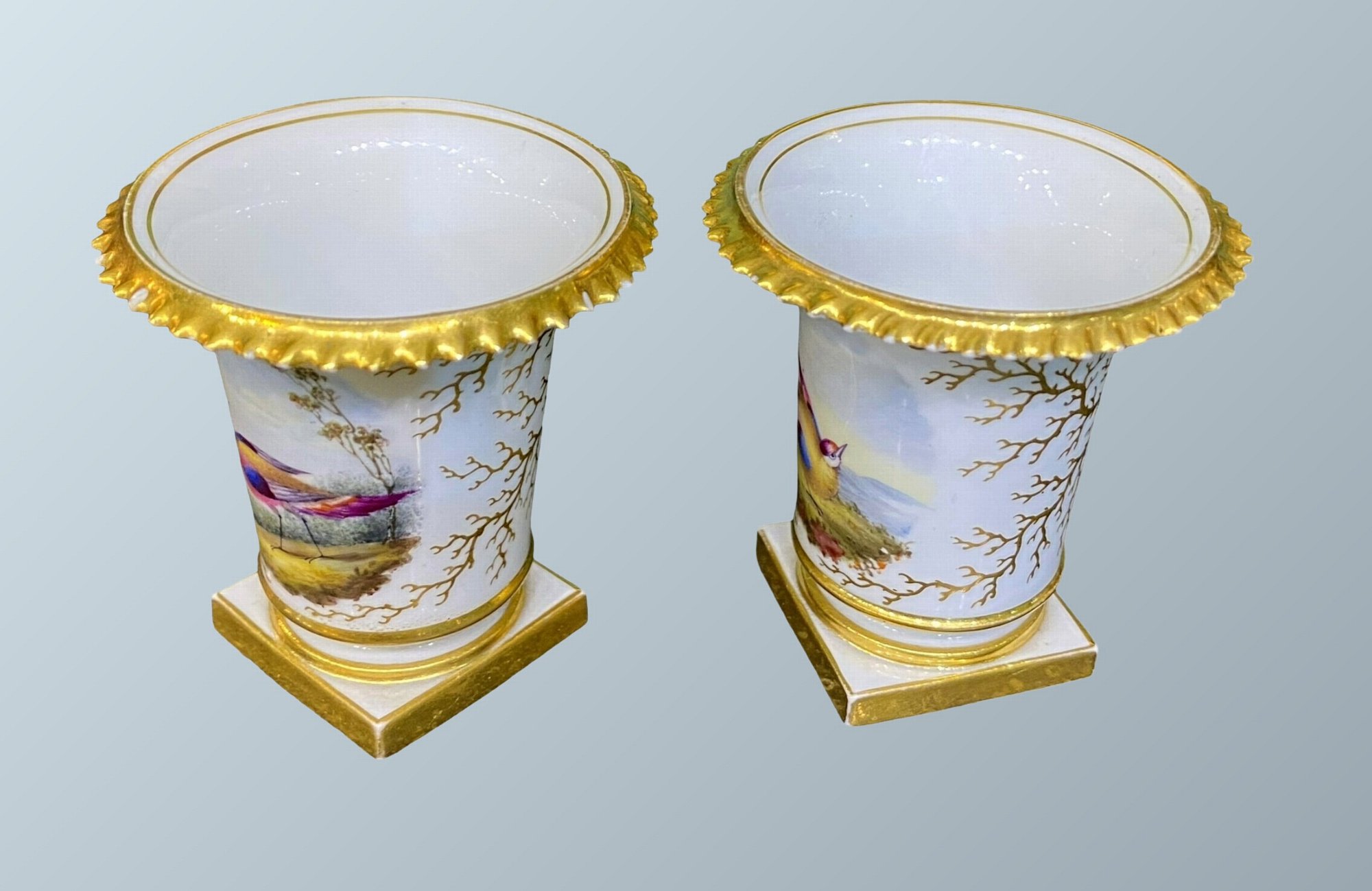 Each of flared square base form with a gilt gadrooned rim over a front painted oval of a brightly coloured fanciful bird, and decorated with a gilt seaweed pattern.
