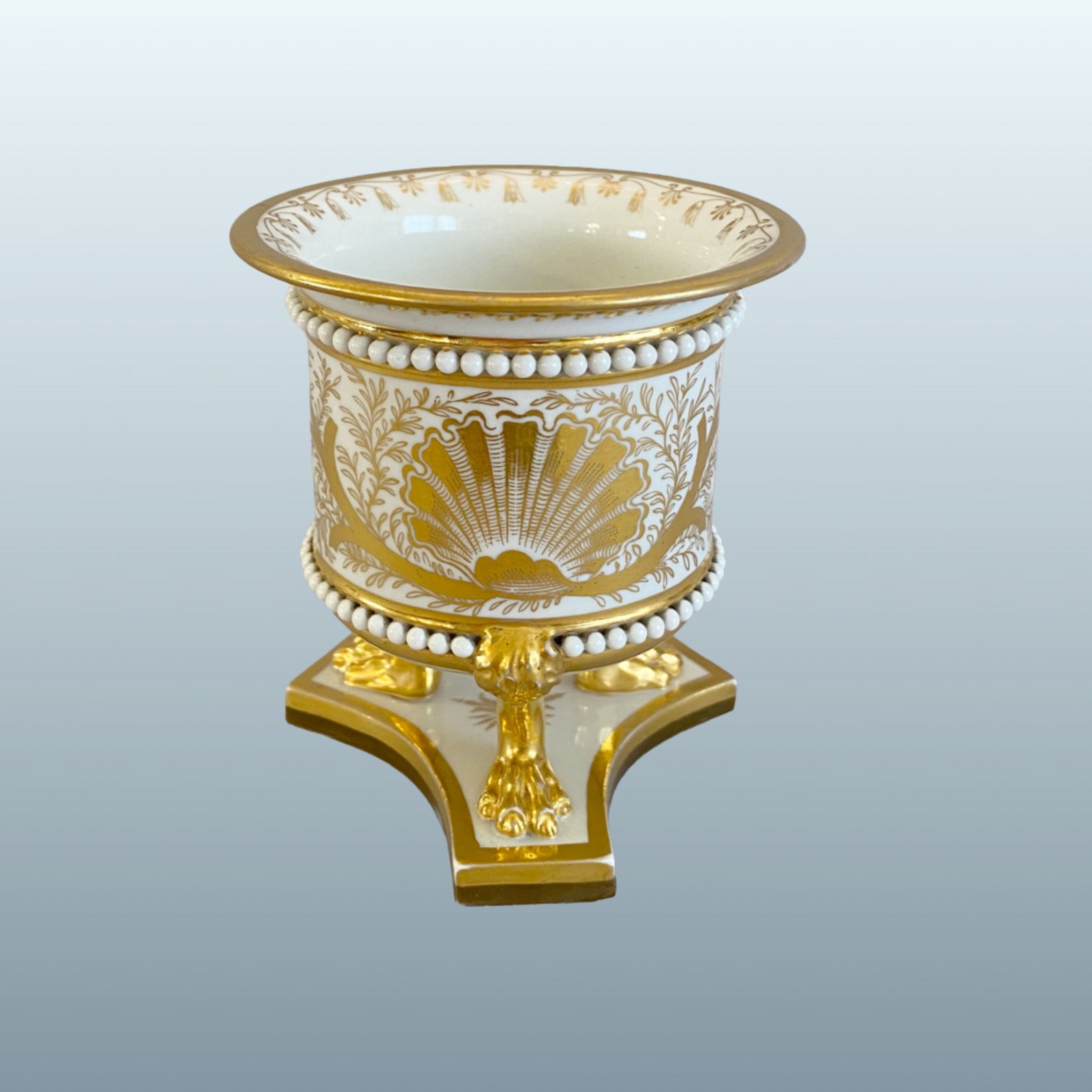 The cylindrical body with white pearl collars & rasied on three gilded lions legs upon a triform base. Finely painted with a named scene to the front "A View of Derwentwater in Cumberland" of figures in a boat upon the lake with the mountains in the distance.