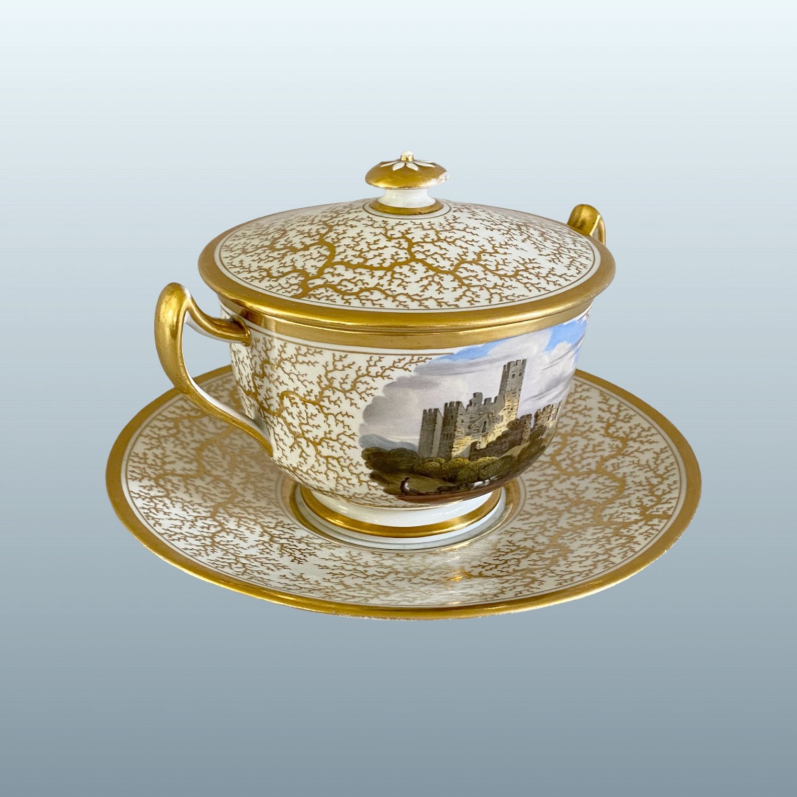 A FINE FLIGHT BARR & BARR WORCESTER PORCELAIN TWO HANDLED CUP, COVER AND STAND. CIRCA 1820. The cup beautifully painted with a named scene of Bothal Castle, Northumberland reserved upon a continuous seaweed gilt pattern, which is continued on the cover and stand and bordered with gilt bands. Makers impressed mark & in red script: Flight Barr & Barr, Royal Porcelain Works Worcester- London House, No:1 Coventry St. Height: 3.75 inches