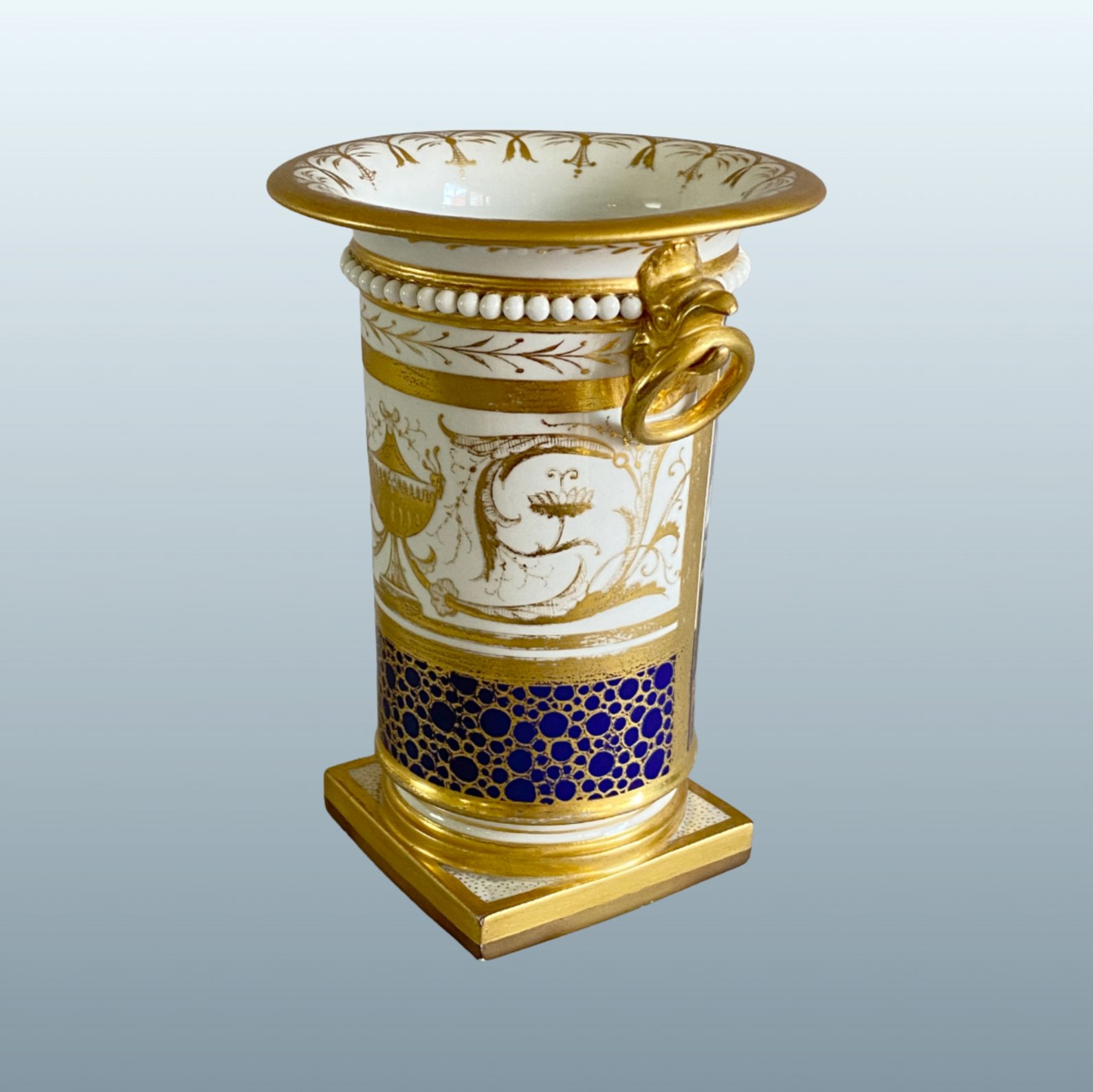 An elegant and highly decorative early 19th-century Flight Barr & Barr spill vase, with a cylindrical body rising from a square plinth base to a gently flared rim, & white beaded collar & distinctive gilt bird’s head and ring handles. The body is centred with a finely painted full-length portrait panel depicting a contemplative male figure set within a landscape, inspired by Timon from Timon of Athens. An inscription reads: “Timon: Let me look back at thee,” referencing the character’s introspective and tragic narrative. The reverse is richly decorated with gilded neoclassical motifs reserved upon a deep blue & marbled ground, providing a striking contrast to the figural panel and further enhancing the vase’s opulent appearance. Full marks under referencing Flight & Barr’s Royal patronage. H: 5.25in