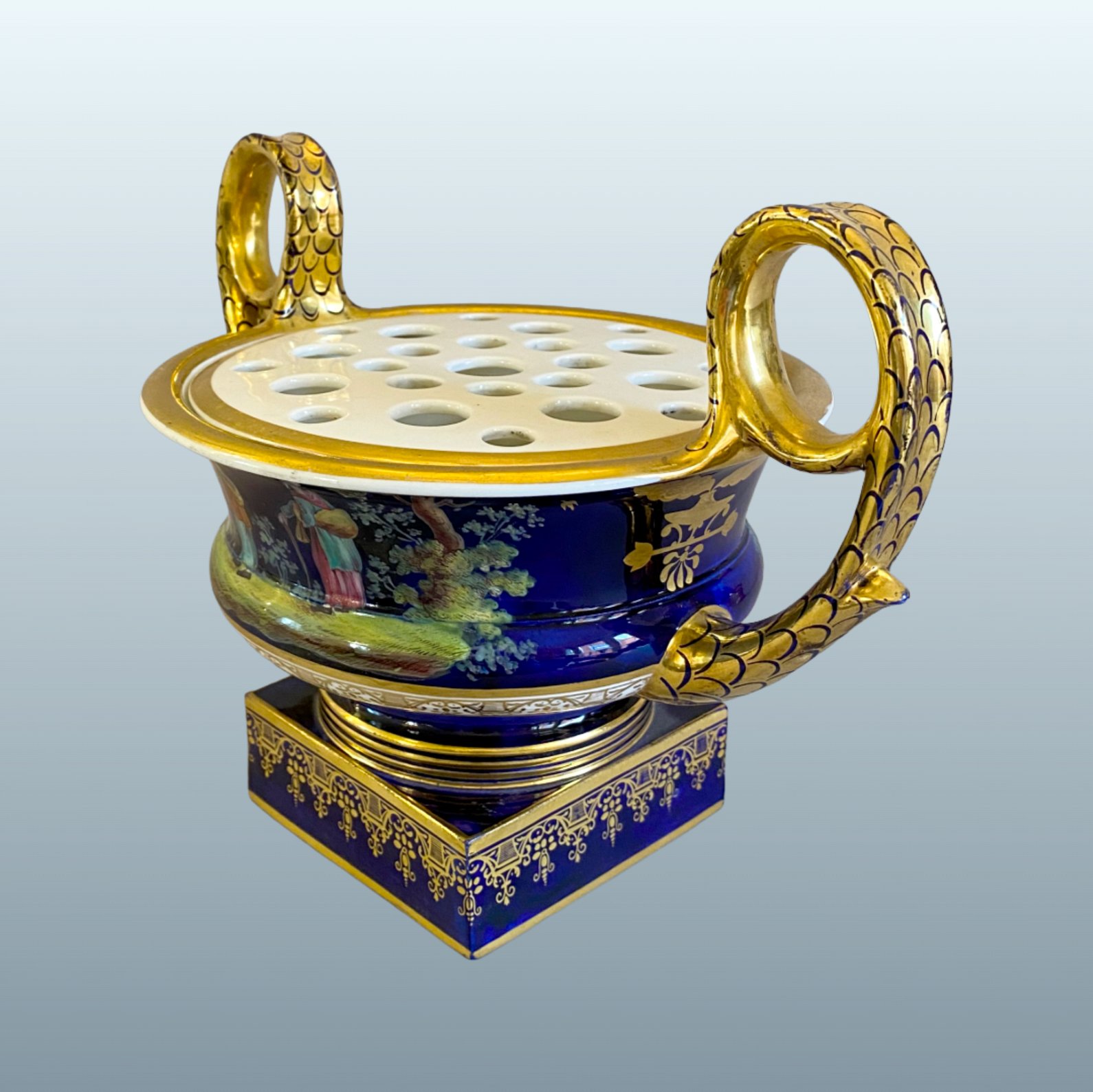 A striking Regency-period pot-pourri vase and cover of classical krater form, the bowl raised on a square plinth base and flanked by applied ring handles. The body is richly decorated with finely painted, thickly enamelled vignettes of rustic figures in pastoral landscapes, reserved against a deep cobalt blue ground. The surface is further enlivened with elaborate gilt ornament, including scrolling leaf motifs and strapwork, while the ring handles are detailed with distinctive gilded scale patterning. The combination of vibrant enamels, sumptuous gilding, and bold ground colour reflects the opulence and technical sophistication of Spode’s early 19th-century production. Marked to the underside: SPODE 3234.