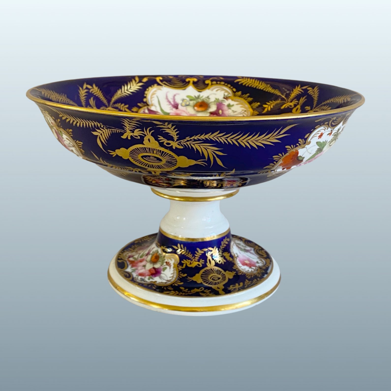 An elegant and finely proportioned centrepiece, the deep circular bowl raised on a pedestal issuing from a spreading foot. Intended as the focal element of a dessert service, such pieces would have been used to display fruit, sweetmeats, or ornamental arrangements on the dining table.