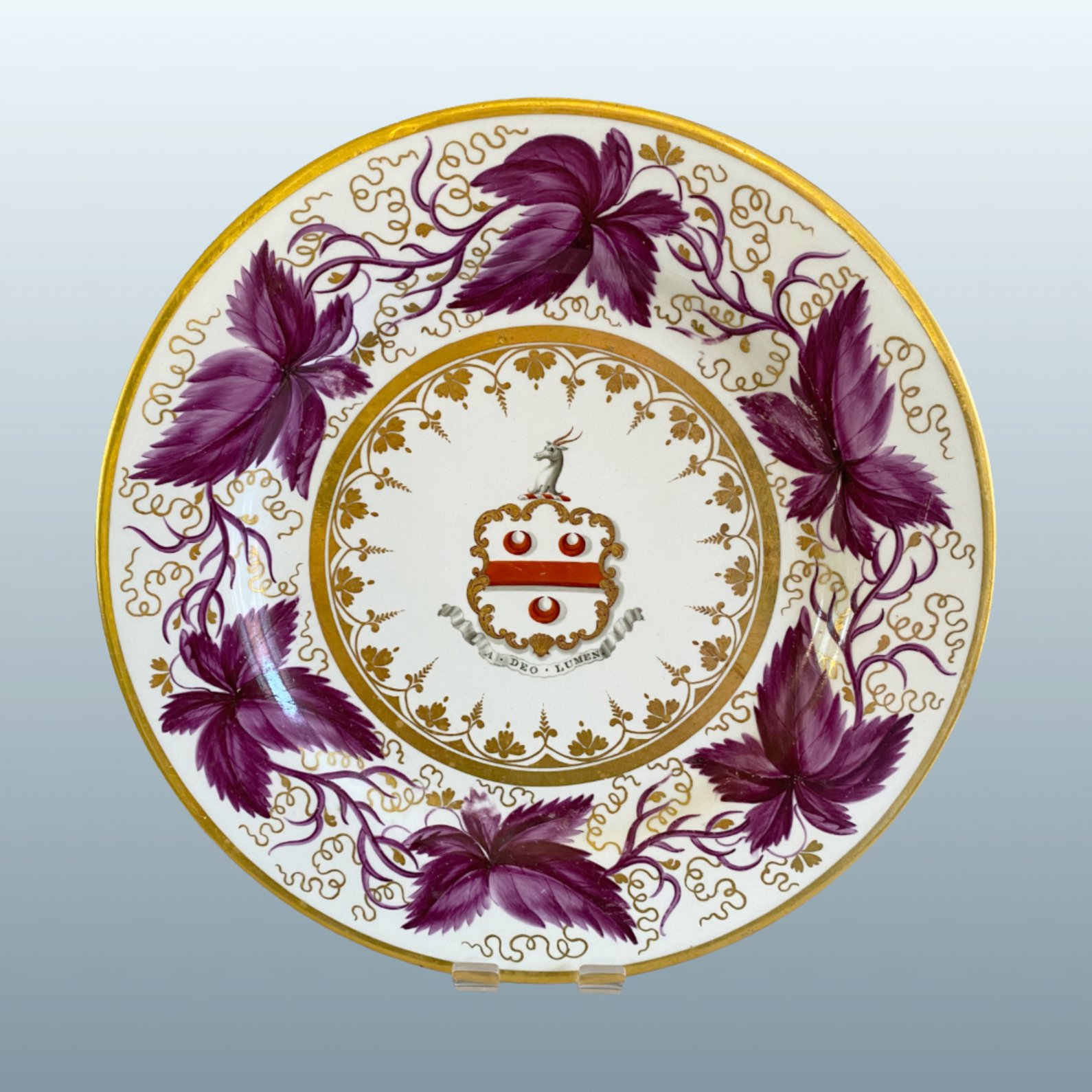 A BARR FLIGHT & BARR WORCESTER PORCELAIN ARMORIAL DESSERT PLATE, CIRCA 1820. A finely decorated Regency-period dessert plate, the centre painted in full colour with an heraldic armorial bearing, complete with motto beneath within a scrolling banner reading “A Deo Lumen” (“Light from God”). The armorial is enclosed within a gilt-edged roundel, further enriched by a continuous band of finely executed neoclassical gilt ornament.