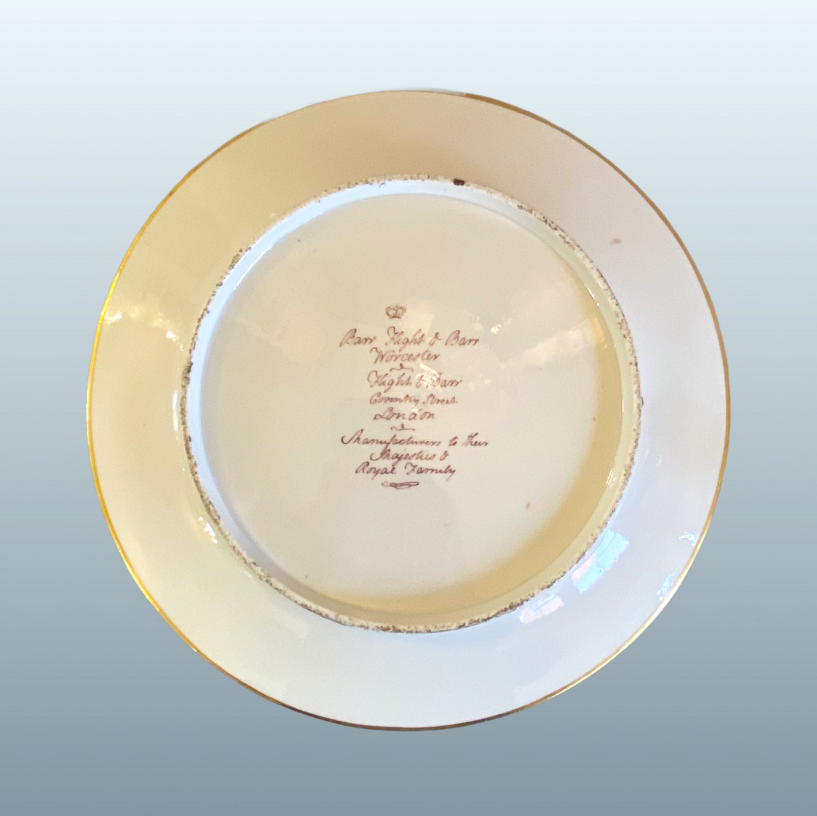 The underside bears full factory marks, including references to the manufactory’s prestigious association with “Their Majesties and the Royal Family,” reflecting the high status and patronage enjoyed by Barr, Flight & Barr during this period.