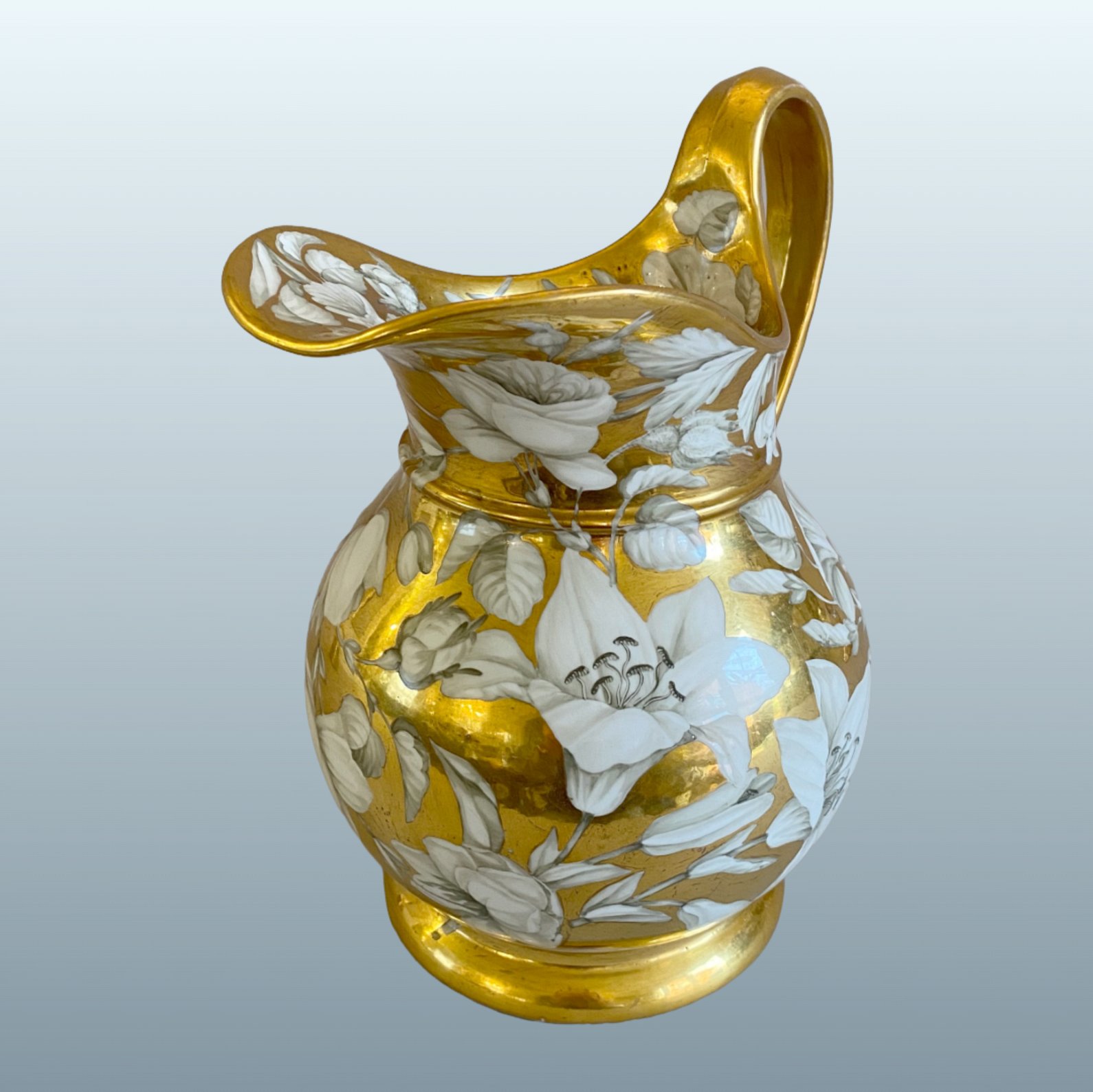 Of impressive scale and bellied form, profusely decorated with an abundant arrangement of white flowers— including roses, lilies and tulips—delicately heightened with monochrome detailing and reserved against a richly burnished gilt ground. The decoration continues unusually within the inner rim, demonstrating a high level of finish and attention to detail.