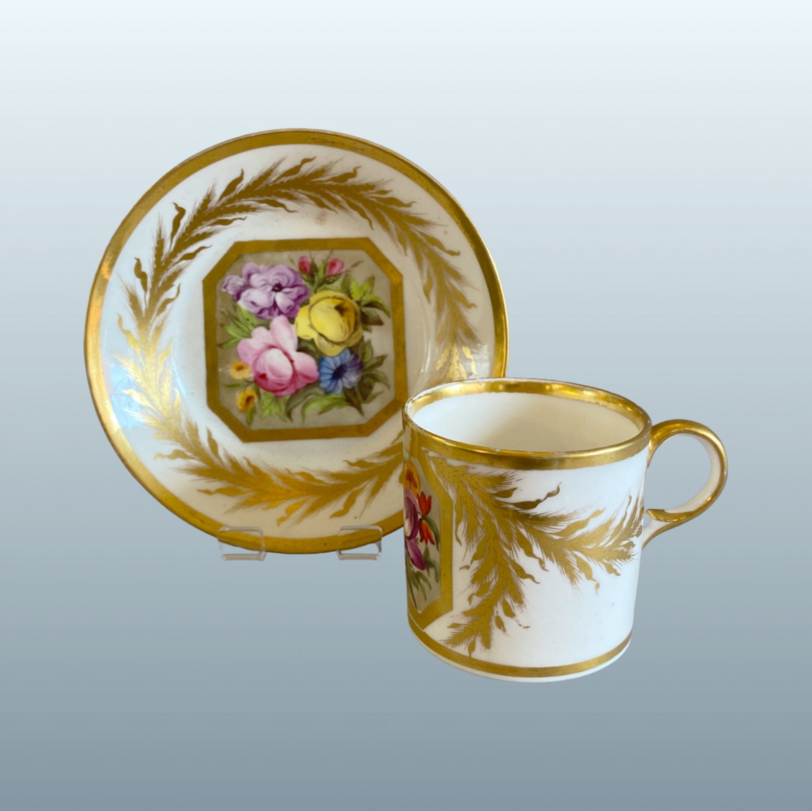 The deeply dished saucer is richly decorated with gilt banding and centres on an octagonal panel enclosing a vibrant arrangement of brightly coloured flowers, framed in gilt and encircled by a continuous foliate wreath. The straight-sided coffee can is complemented by a gilt loop handle and harmonious decorative scheme.
