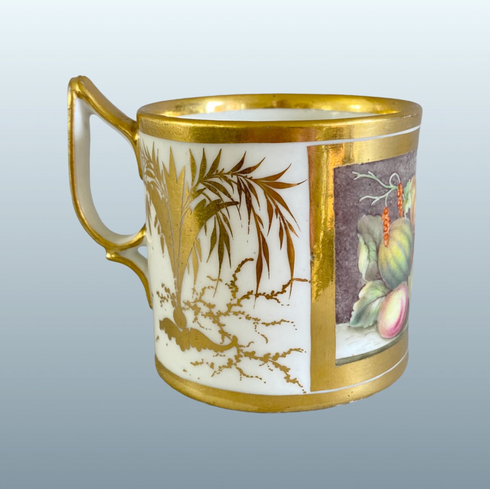 A GOOD DERBY PORCELAIN COFFEE CAN, CIRCA 1800 A beautiful can with gilt borders and handle, the front is finely painted with a vibrant gilt bordered panel of assorted fruits tumbling from a wicker basket, rendered in rich, naturalistic colours. The reverse is decorated with gilt frond ornament, providing a refined balance to the composition. Full Derby marks to the base.