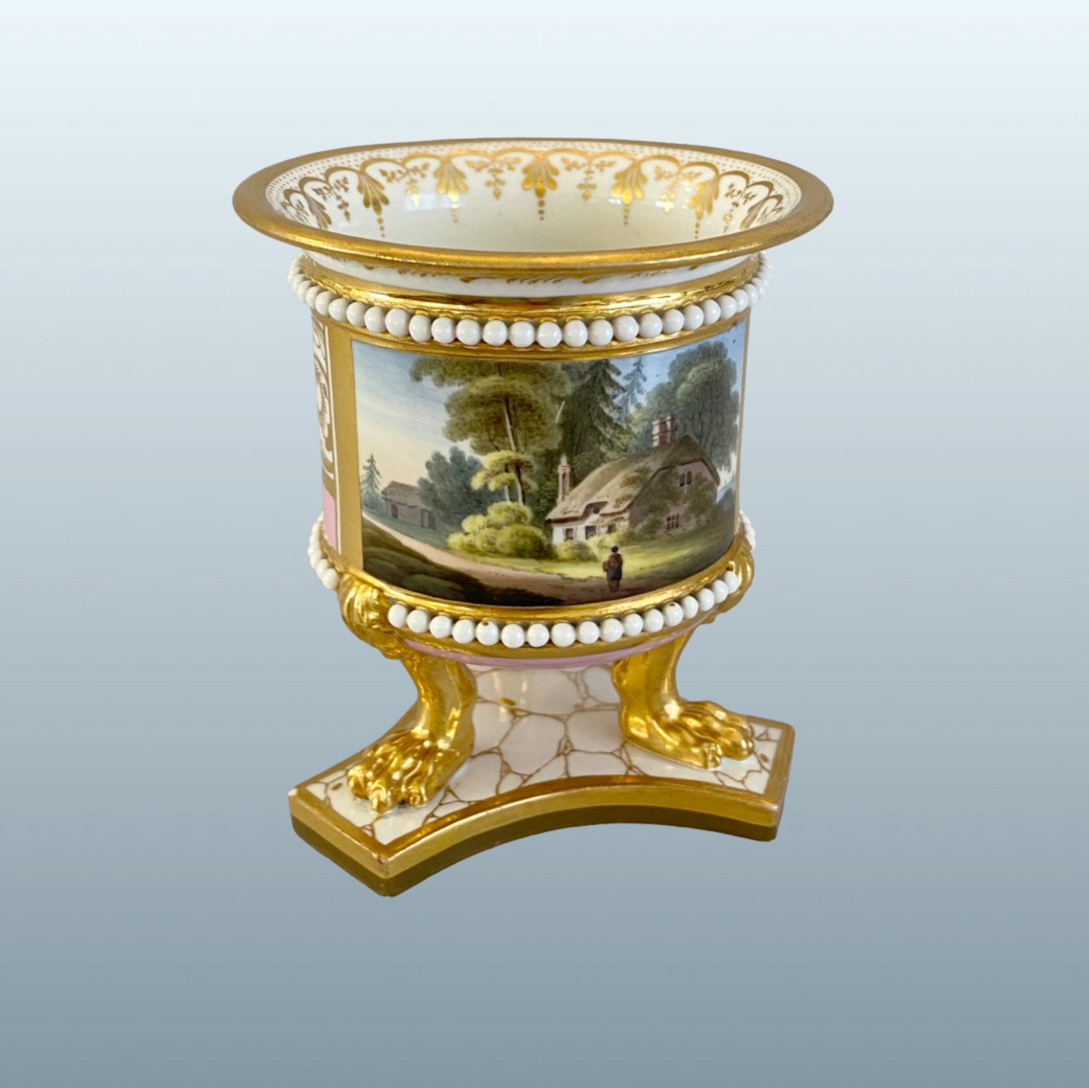 A FINE FLIGHT BARR & BARR WORCESTER PORCELAIN MINIATURE VASE, CIRCA 1815. This finely modelled miniature vase is raised on three richly gilded lion’s paw feet set upon a marbled and gilt triform base. The body is encircled by beaded white “pearl” bands and finished in a vibrant pink ground, reserved with delicately executed gilt neoclassical ornament. The inner rim is enriched with a continuous trailing gilt harebell band. The principal reserve is painted in full colour with a named view of Binstead Cottage, Isle of Wight, a subject in keeping with the early 19th-century fashion for British topographical scenes inspired by the Picturesque movement. Miniature vases of this type were intended as cabinet pieces, combining technical refinement with decorative elegance on an intimate scale. The underside retains full maker’s marks for Flight, Barr & Barr, confirming its manufacture & Royal patronage during this celebrated period of Worcester production. Height: 3.5in.