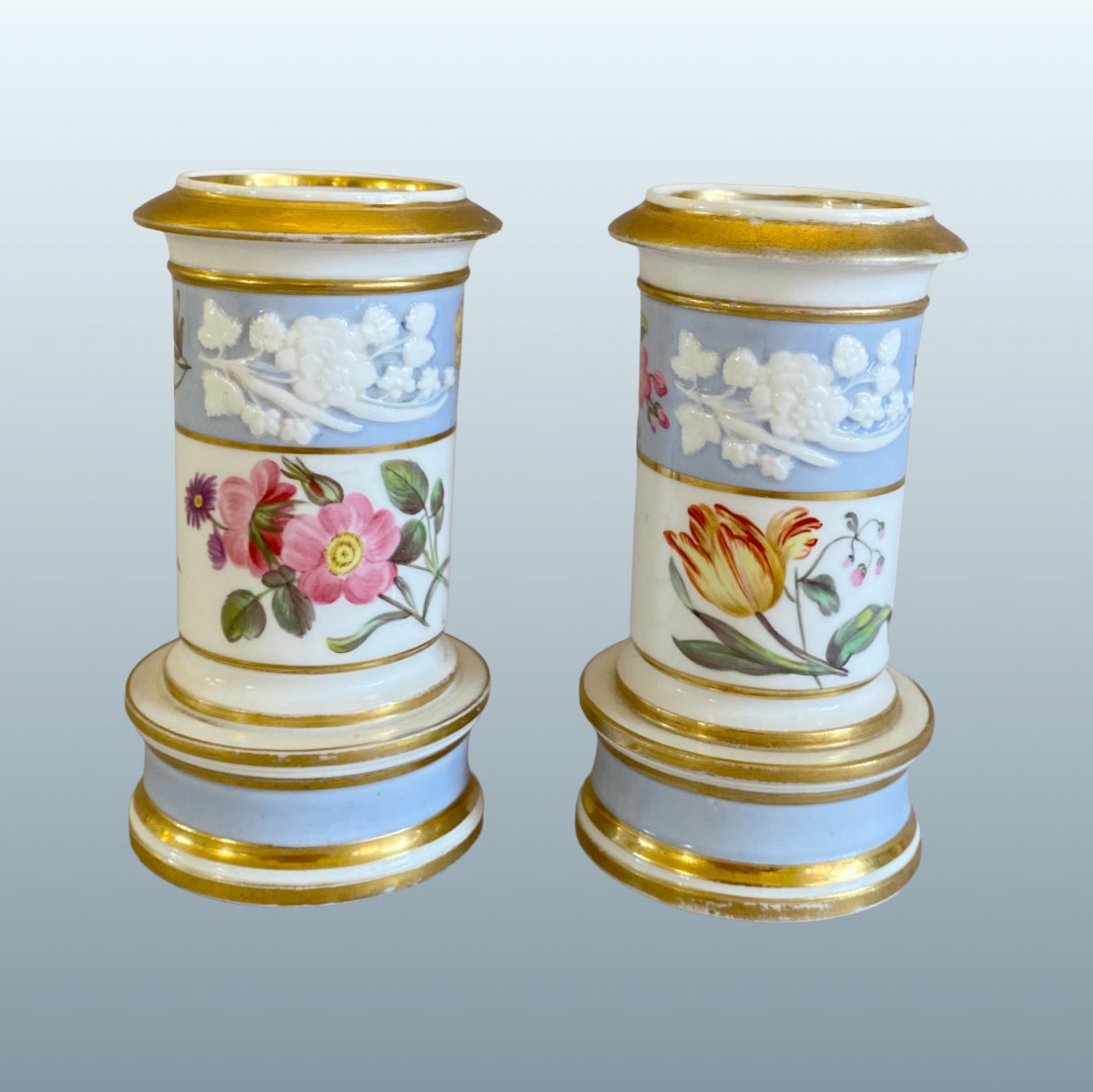 A FINE PAIR OF SPODE BOTANICAL SPILL VASES. Pattern No. 2004, circa 1815. A finely matched pair of early 19th-century English porcelain spill vases of elegant cylindrical form. Each vase is decorated with delicately applied gilt bands framing alternating zones of pale powder blue and white ground. The blue-ground reserves are richly painted with vibrant, naturalistic flower sprays, alternating with raised (relief)) white floral motifs. The botanical decoration demonstrates Spode’s characteristic precision and artistry, with carefully observed blooms rendered in bright enamels. Originally intended for holding spills—slender sticks used to transfer flame for lighting candles or lamps—these vases exemplify both the decorative and practical sophistication of early 19th-century domestic objects.
