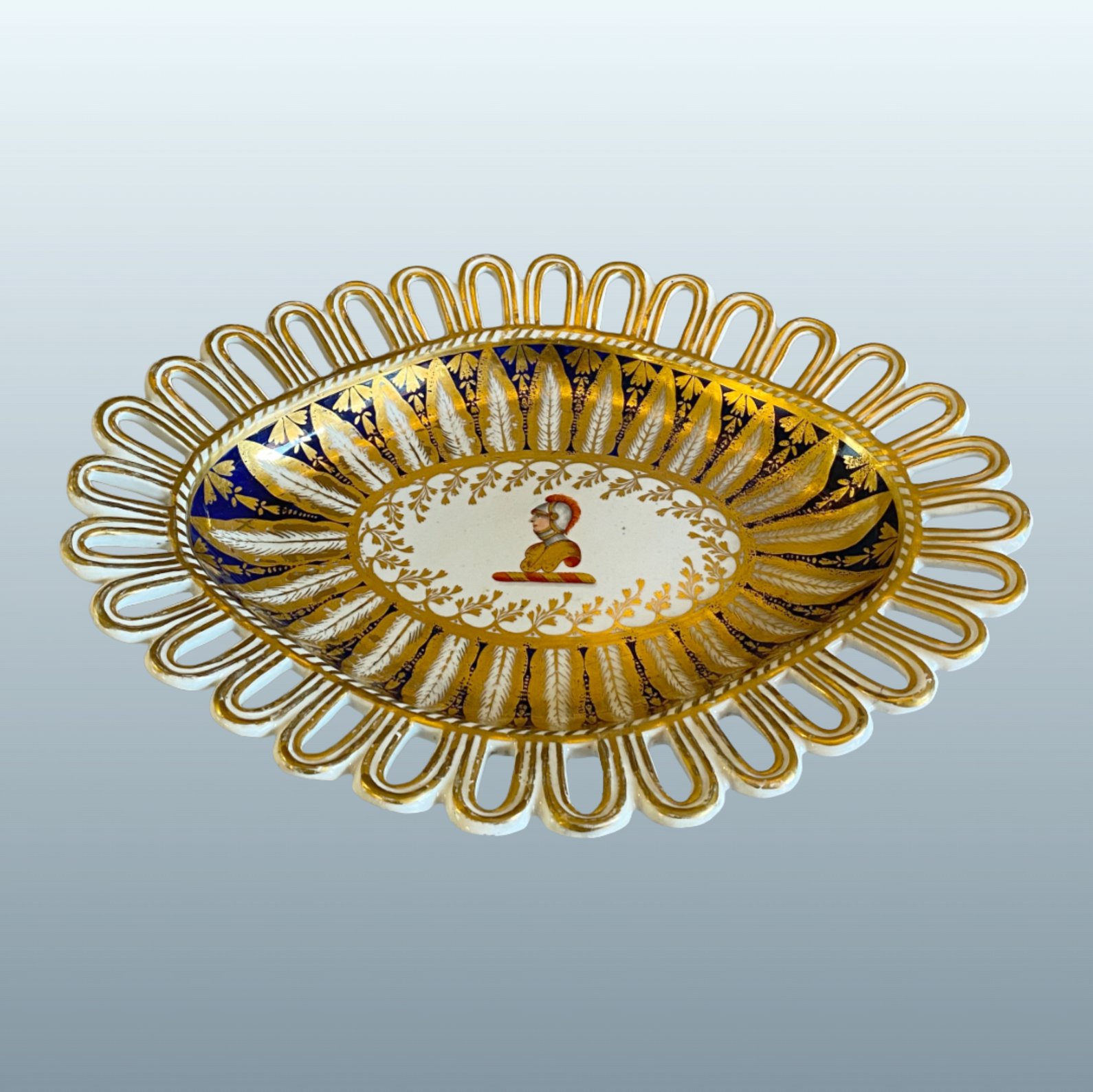 Of distinctive oval lozenge form, the rim with an elegant looped and pierced border, the centre painted in full colour with a heraldic crest depicting an armoured figure. This is enclosed within a deep cobalt-blue ground, richly decorated with a broad band of stylised foliage, finely tooled in gold. Script mark to the underside: “Chamberlains Worcester No. 126.” 11in x 8.5in