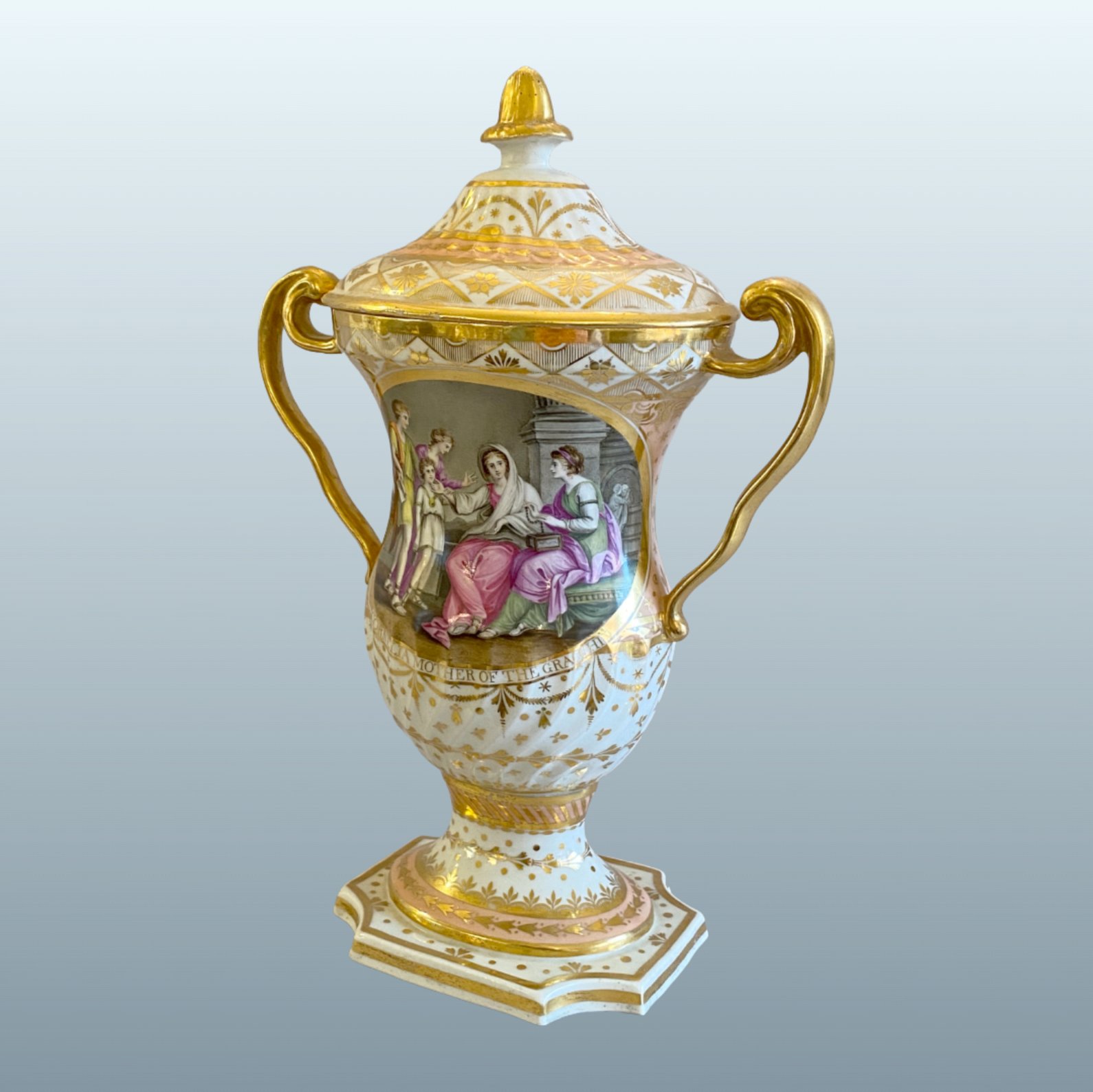 The principal painted panel to the front depicts Cornelia, Mother of the Gracchi, and may be attributed, on stylistic grounds, to John Wood, one of the leading early figure painters associated with the Worcester manufactory. The composition derives from the influential painting by Angelica Kauffman, exhibited in 1785, and widely disseminated through engravings.