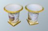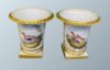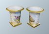 Each of flared square base form with a gilt gadrooned rim over a front painted oval of a brightly coloured fanciful bird, and decorated with a gilt seaweed pattern.
