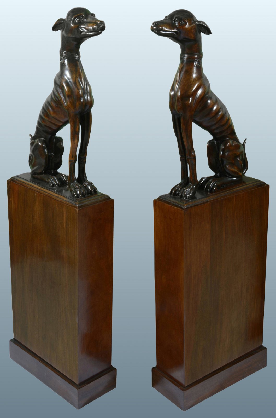 A MAGNIFICENT PAIR OF 19TH CENTURY ITALIAN CARVED LIMEWOOD MODELS OF GREYHOUNDS Finely sculpted with attention to detail. Limewood is a popular choice for carving, due to its soft, fine grain, which allows for intricate detail and smooth finishes.