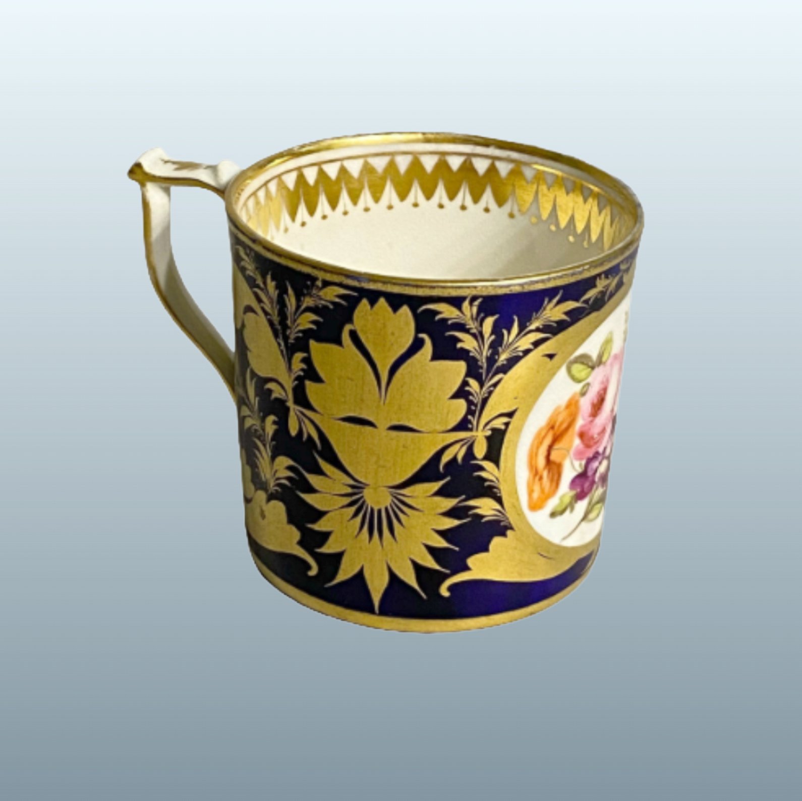 A Fine Derby Porcelain Coffee Can, circa 1820. Finely painted with a vivid panel of brightly painted flowers, reserved on a deep blue ground enriched with elaborate neoclassical gilt scrollwork. This type of naturalistic flower painting was a hall mark of early 19th Century porcelain reflecting the contemporary enthusiasm for botany and gardens among Regency society.