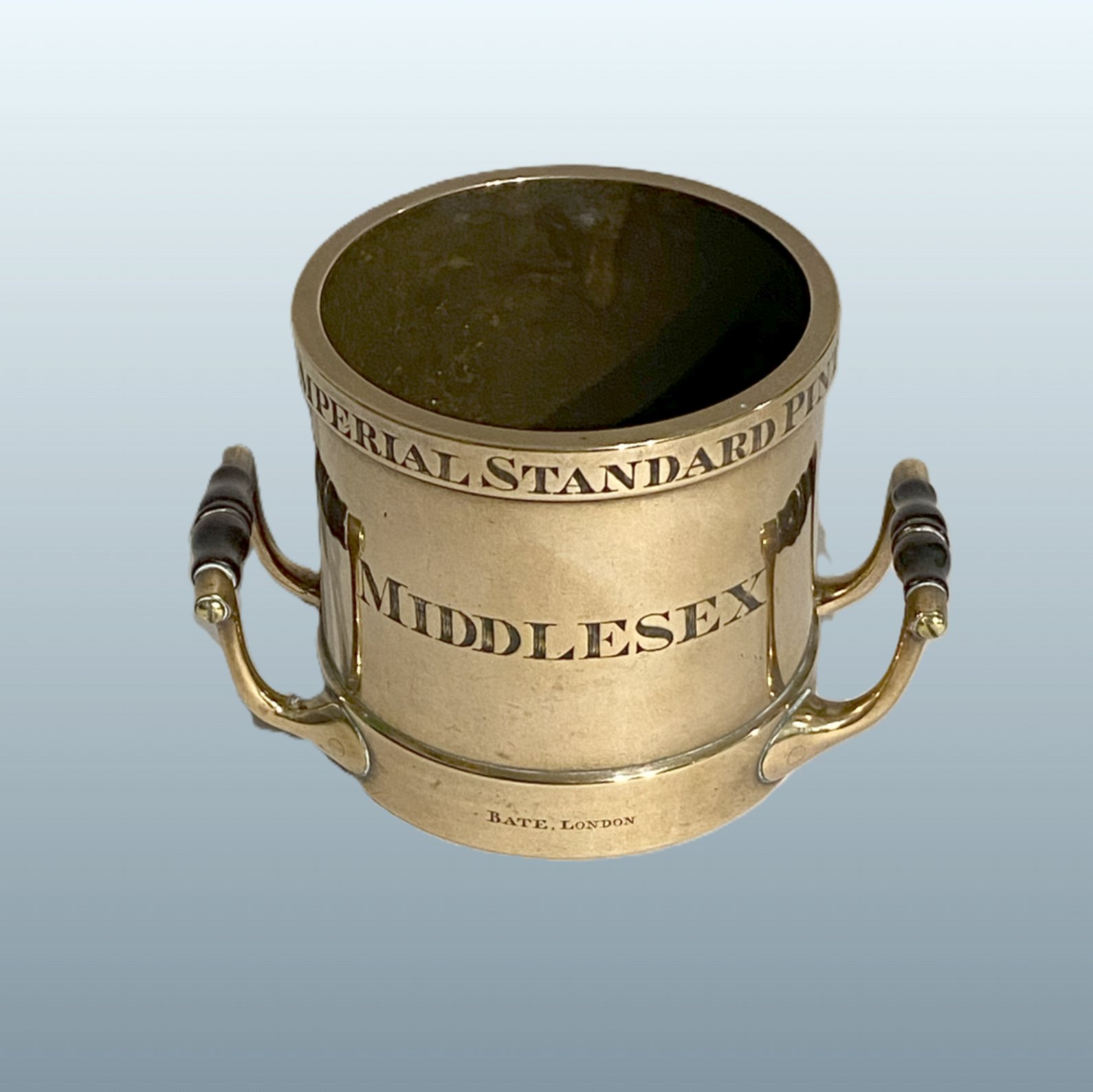 A MID 19th CENTURY IMPERIAL STANDARD PINT CAPACITY MEASURE FOR MIDDLESEX By Bate London. Upswept turned lignum vitae ballustroid Handles.