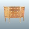 Of demi-lune form, with a moulded shaped breche d’Alep marble top, above three drawers, the stiles inlaid to simulate fluting, with pierced guilloche mounts with berried laurel leaves, flanked by a door enclosing two shelves, the frieze inlaid with lunettes, on tapering legs inlaid to simulate fluting, terminating in tupie feet, the whole inlaid with strapwork panels, the handles in the form of berried laurel wreaths with classical profile medallion backplates.