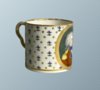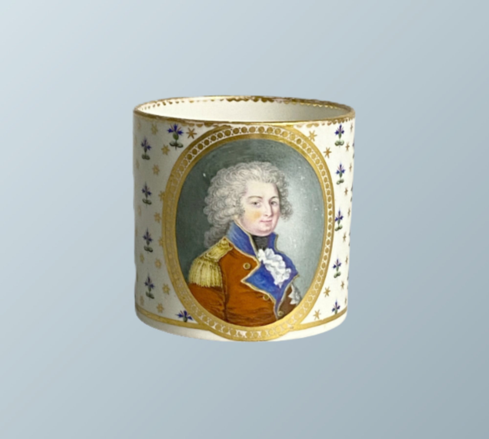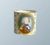 The front with a full colour portrait of the Duke of York within a beaded gilt oval panel, reserved on a white ground with gilt star and blue motifs. Derby marks in puce of Crown, crossed batons, dots & “D”.