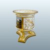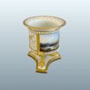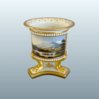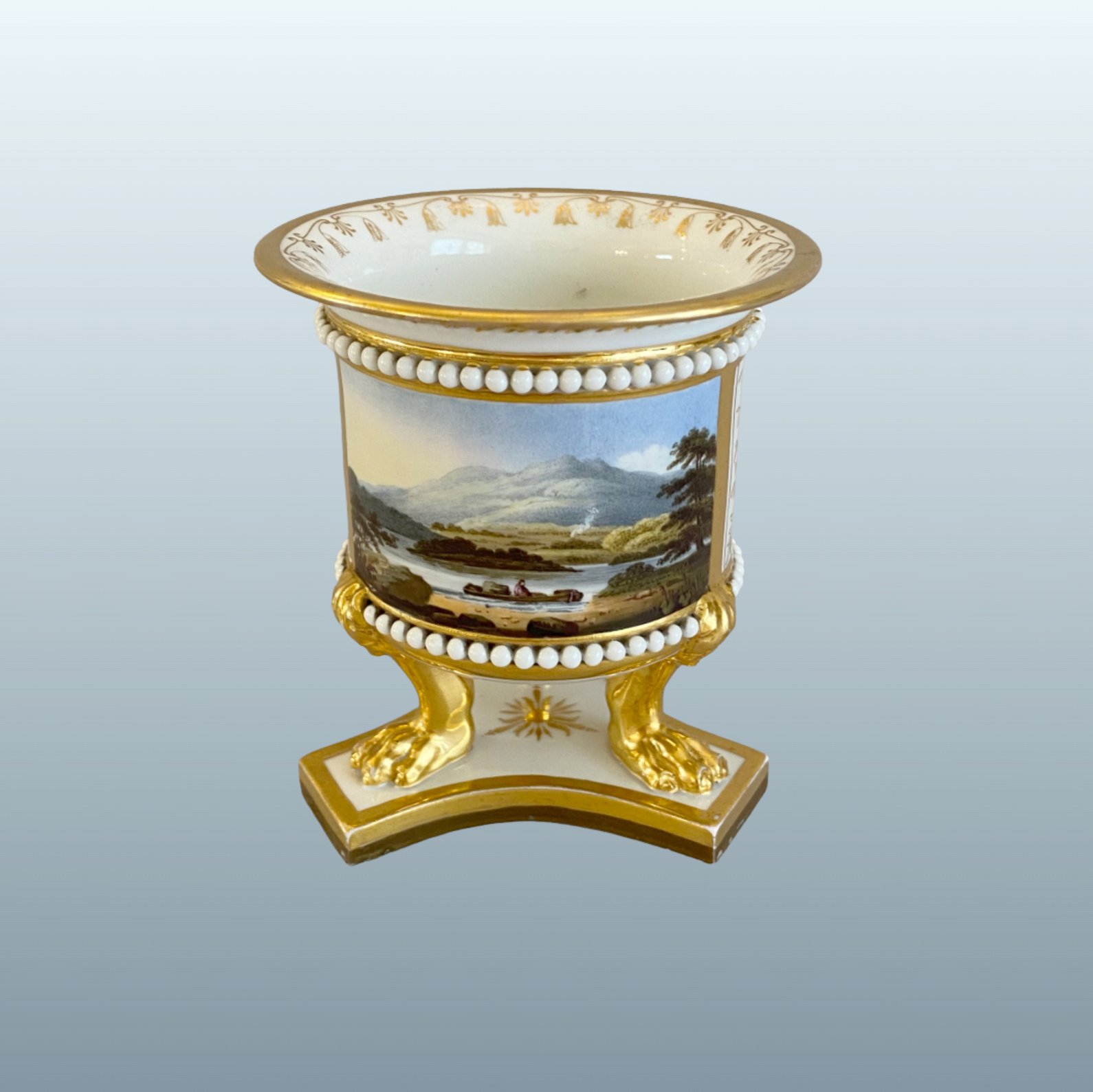 The cylindrical body with white pearl collars & rasied on three gilded lions legs upon a triform base. Finely painted with a named scene to the front "A View of Derwentwater in Cumberland" of figures in a boat upon the lake with the mountains in the distance.
