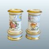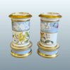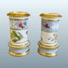 A FINE PAIR OF SPODE BOTANICAL SPILL VASES. Pattern No. 2004, circa 1815. A finely matched pair of early 19th-century English porcelain spill vases of elegant cylindrical form. Each vase is decorated with delicately applied gilt bands framing alternating zones of pale powder blue and white ground. The blue-ground reserves are richly painted with vibrant, naturalistic flower sprays, alternating with raised (relief)) white floral motifs. The botanical decoration demonstrates Spode’s characteristic precision and artistry, with carefully observed blooms rendered in bright enamels. Originally intended for holding spills—slender sticks used to transfer flame for lighting candles or lamps—these vases exemplify both the decorative and practical sophistication of early 19th-century domestic objects.