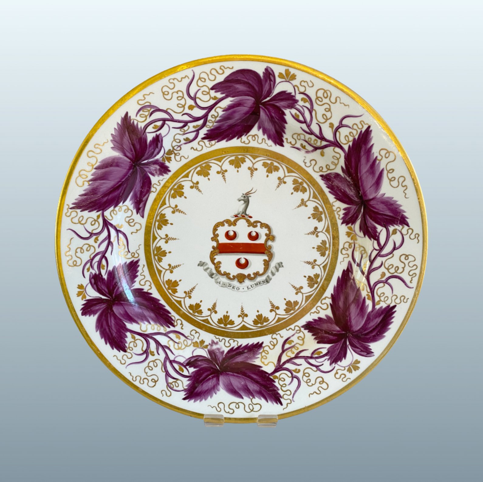 A BARR FLIGHT & BARR WORCESTER PORCELAIN ARMORIAL DESSERT PLATE, CIRCA 1820. A finely decorated Regency-period dessert plate, the centre painted in full colour with an heraldic armorial bearing, complete with motto beneath within a scrolling banner reading “A Deo Lumen” (“Light from God”). The armorial is enclosed within a gilt-edged roundel, further enriched by a continuous band of finely executed neoclassical gilt ornament.