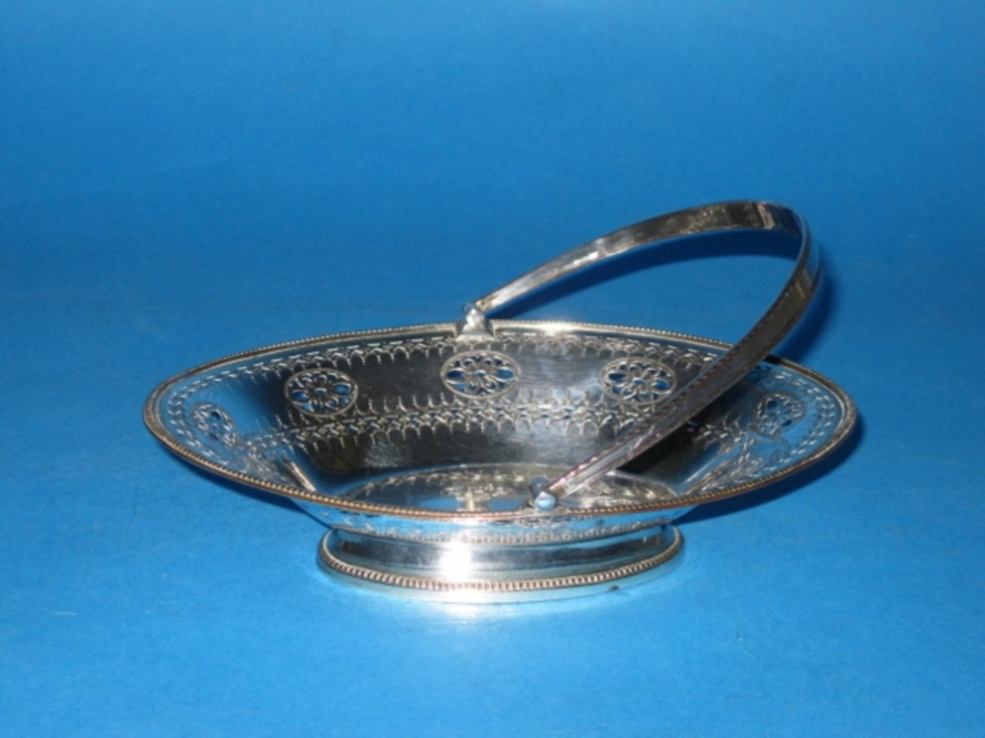Description: A George III Sweetmeat Basket, circa 1775. Of oval swing handled form, with beaded borders, pierced oval floral paterae, pierced geometric bands, on a raised oval foot with beaded borders. 15.2cm x 12cm (6ins x 4.75ins). Illustrated in Crosskey, G., Old Sheffield Plate, Treffry Publishing, 2011, figure 151, page 218. A9963.