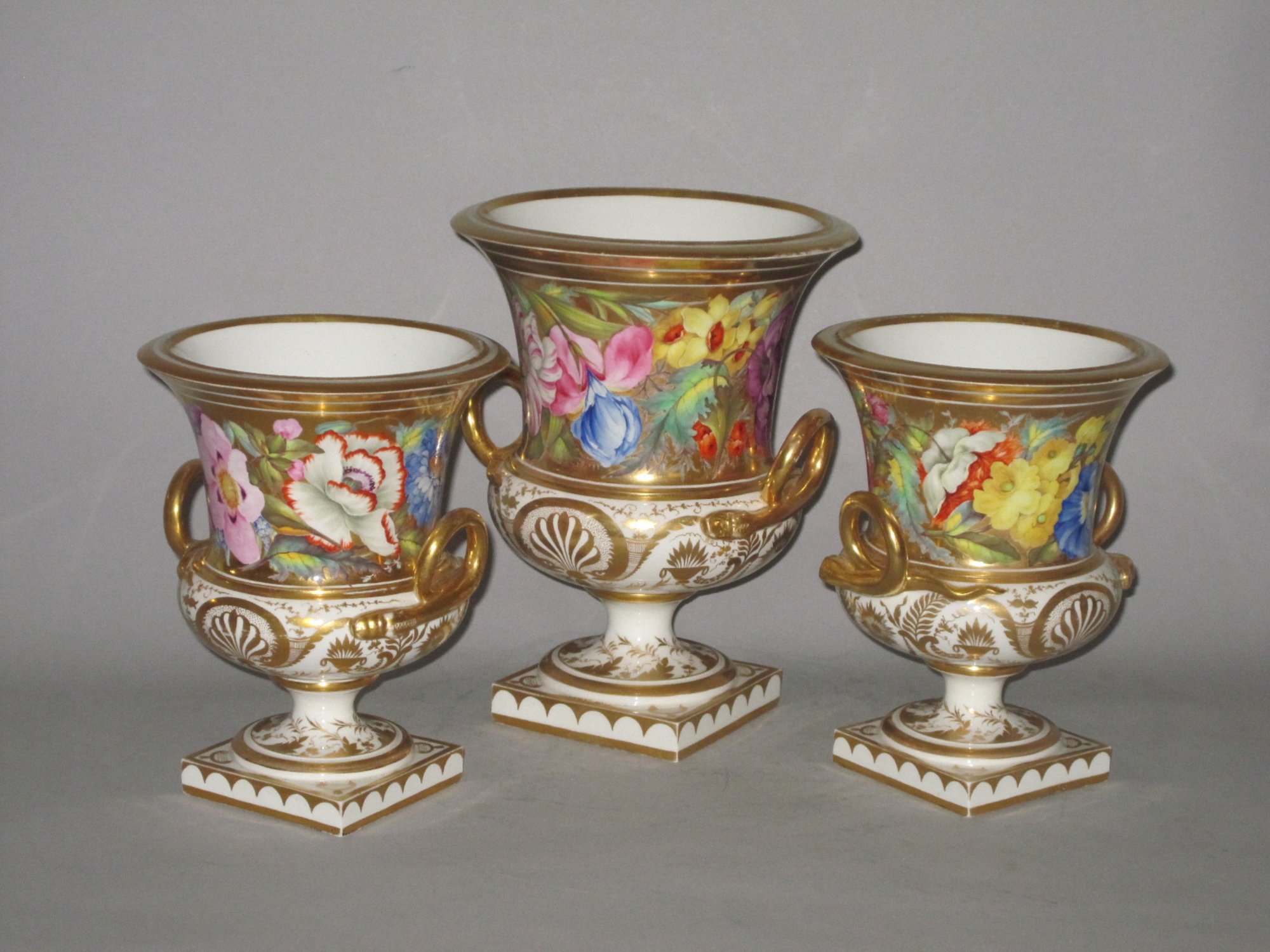 A FINE GARNITURE OF THREE EARLY 19TH CENTURY DERBY PORCELAIN VASES, CIRCA 1815. FINELY PAINTED WITH ENGLISH FLOWERS BY WILLIAM "QUAKER" PEGG.