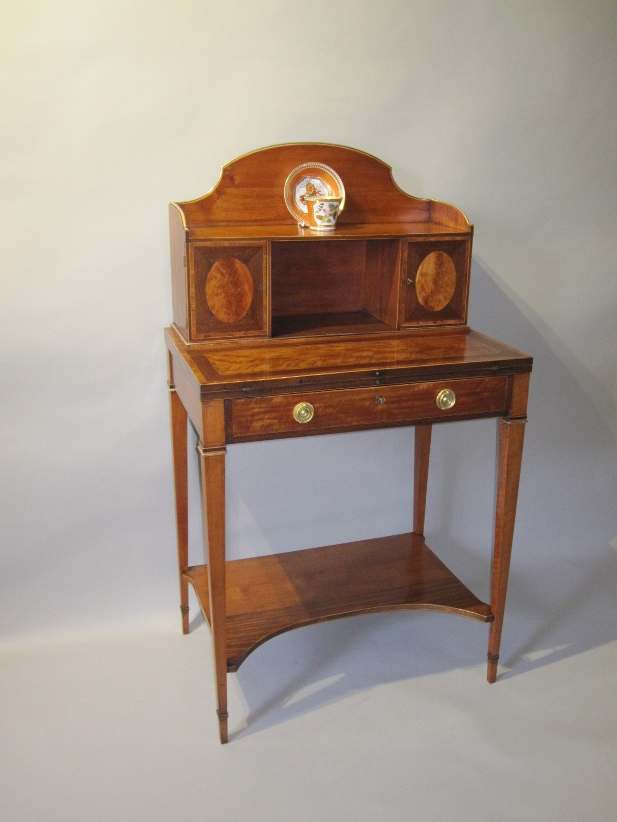 A very elegant piece of exceptional quality, veneered & cross banded throughout with satinwood & harewood & with box line stringing, enriched with gilded bands. The removable arched top shelf with a cubbyhole & two fitted cupboards, over an opening leathered writing surface and a single drawer, raised on four square & tapering legs terminating in spade feet. An exemplary example of this highly fashionable cabinet piece.