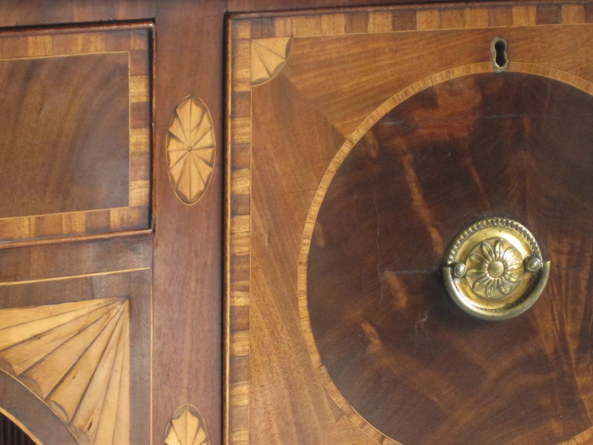A fine quality serpentine form sideboard with excellent use of well figured veneers, crossbanded throughout with rosewood and with box line stringing and excellent inlaid satinwood paterae and fan quartering. The serpentine top over a single drawer and arched apron with a recessed tambour fronted cupboard & flanked by two deep drawers, raised on six square and tapering legs with spade feet. The whole of an excellent colour and patina.