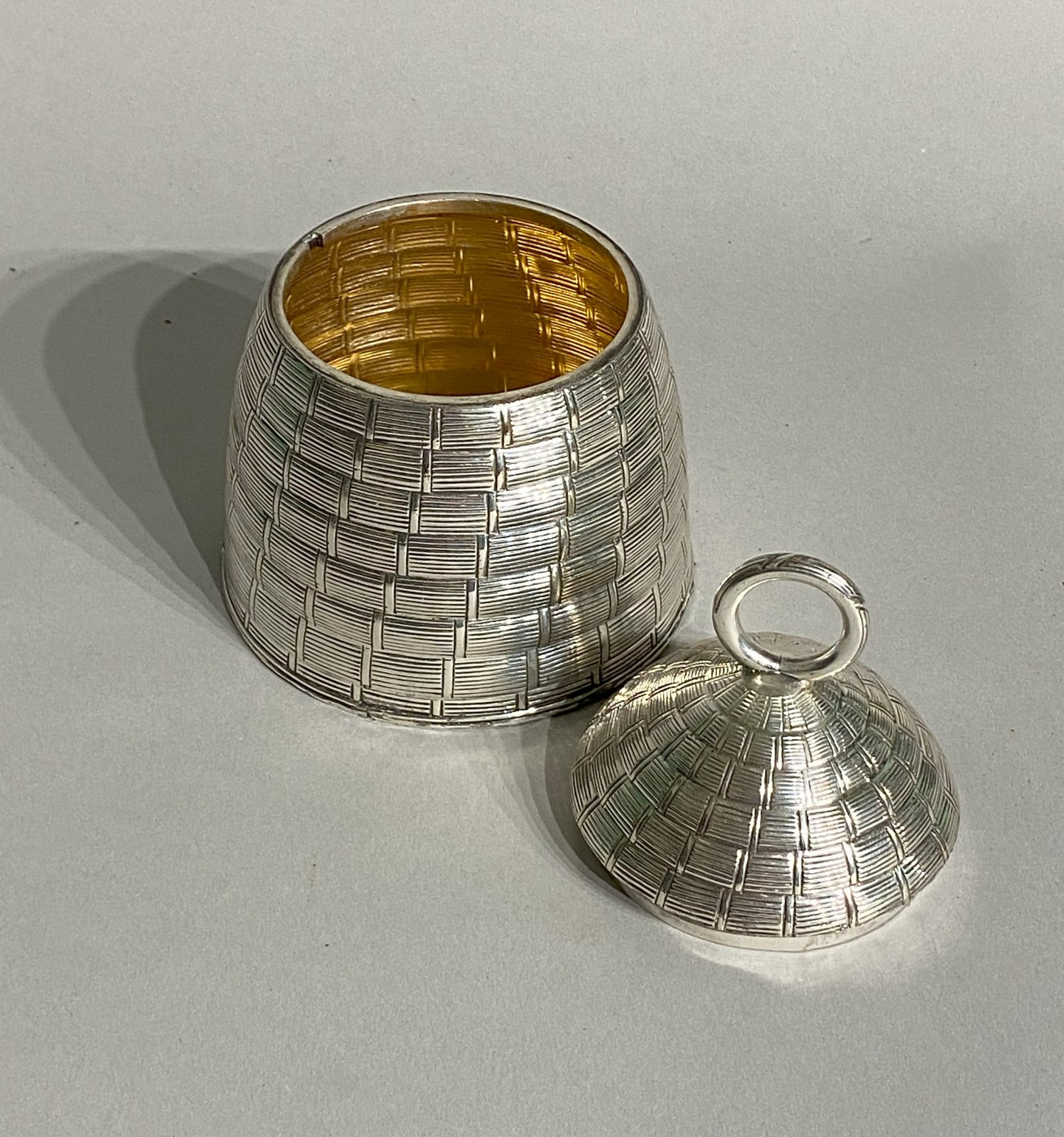 In the form of a beehive with a loop handle and removable cover. The inside retaining its original gilding.