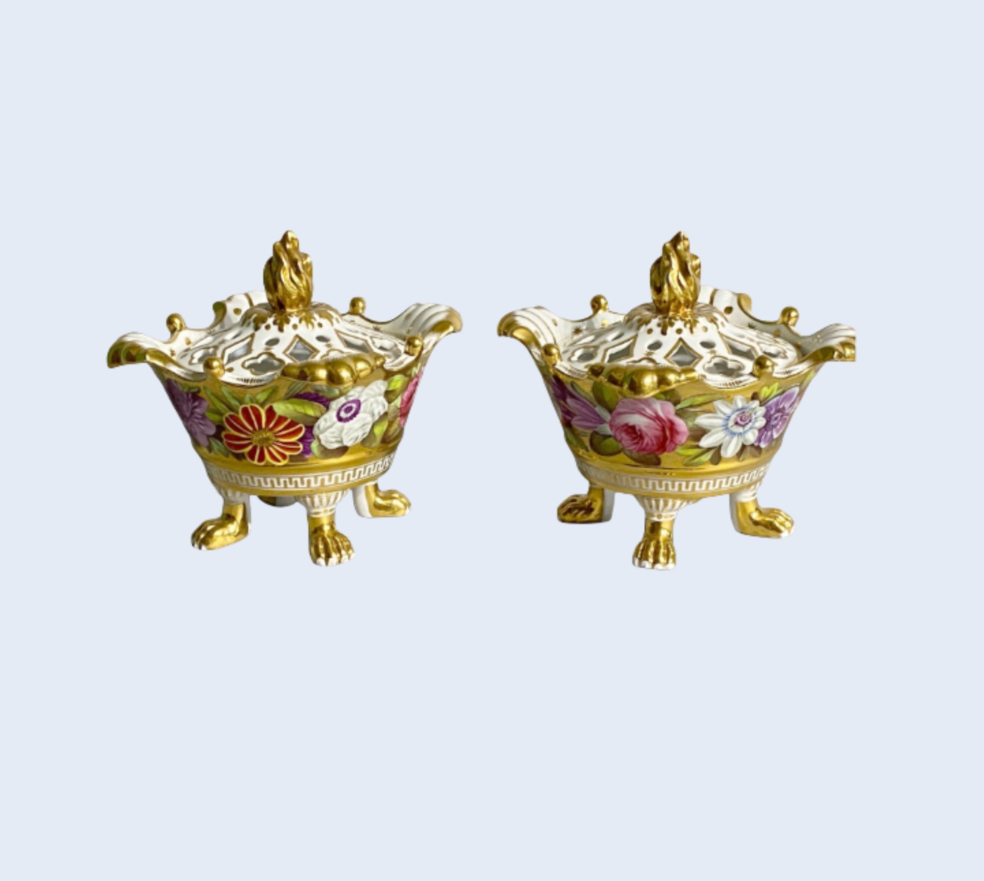 Each with a pierced cover with a gilded flame finial, over the body with curled foliate edges and with a wide continuous band of painted band of colourful English flowers reserved on a solid gilt ground over a stylysed Greek Key border. Raised on four gilded paw feet.
