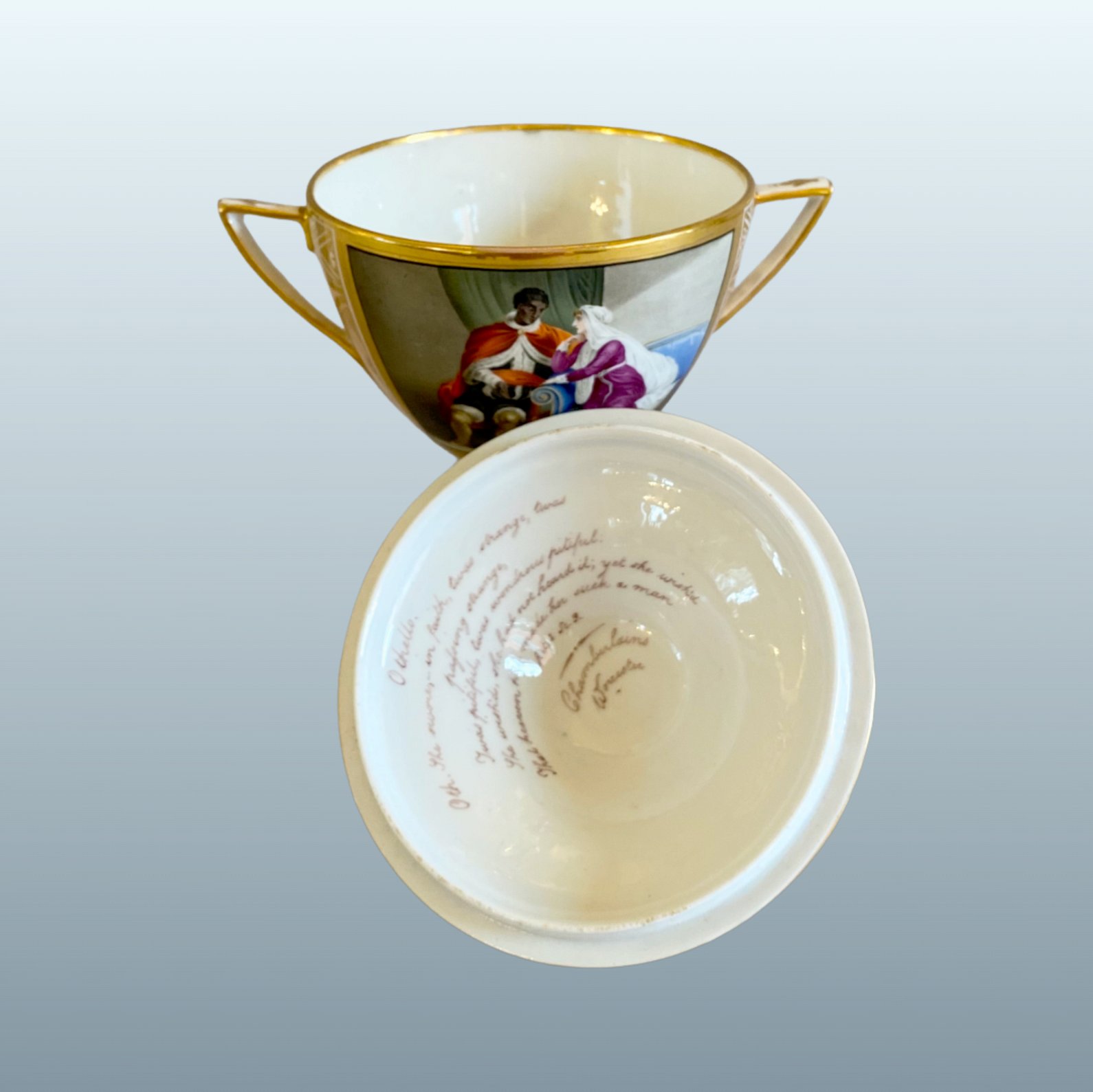 A two handled cup and cover featuring a finely painted full colour vignette, depicting a scene from William Shakespeare’s tragedy Othello. Of elegant vase shape with a matching domed cover and decorative finial, lavishly decorated with gilt Neoclassical elements including lozenge (diamond shape) banding providing a frame for scrolling gilt anthemion (honeysuckle).Script reference under the cover  “Chamberlains Worcester” & Othello Oth: She swore in Faith, twas strange, twas passing strange, twas pitiful, twas wonderous pitiful. She wished she had not heard it, yet she wished That heaven had made her such a man. Act 1 Sc. 3 The combination of theatrical subjects with strict Neoclassical motifs—like the anthemion and lozenge—catered to the sophisticated tastes of the British nobility and the Prince Regent, who frequently commissioned services from the Worcester factory. This piece exemplifies the 19th-century fascination with the "Shakespeare Gallery," Narrative scenes from popular literature and plays like Othello were highly sought after, as they showcased the skill of the factory's master painters.