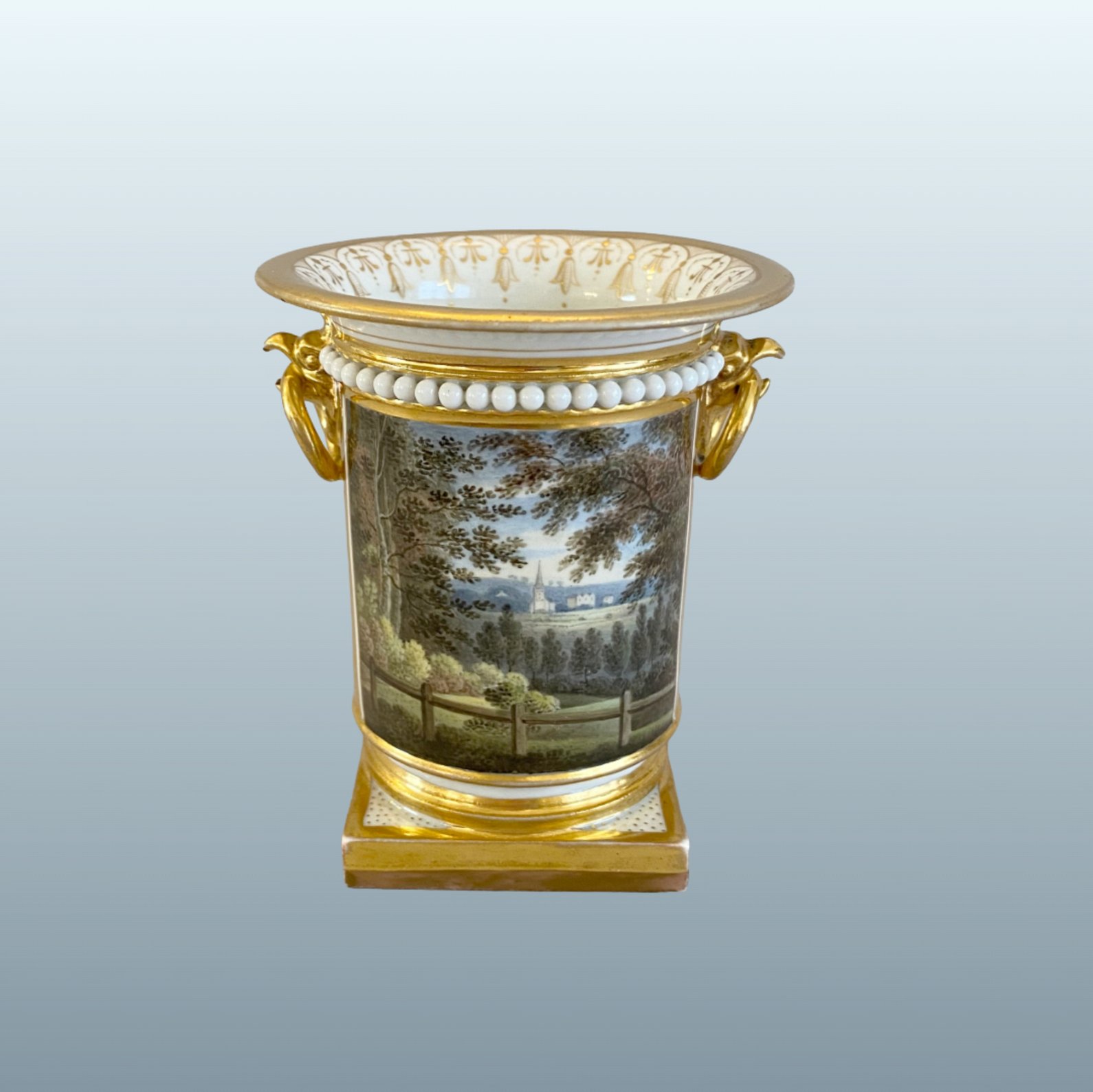 A FINE FLIGHT BARR & BARR WORCESTER PORCELAIN MINIATURE VASE, CIRCA 1815. Of cylindrical form with a trailing harebell inner gilt rim, with beaded white collar & gilt bird’s head and ring handles, set against a pink ground with gilt neoclassical motifs. The central full-colour enamel reserve depicts Olney Church, Buckinghamshire, accompanied by an extract from William Cowper’s The Task (1785)“Tall spire from which the sound of cheerful bells /Just undulates upon the list’ning ear.”