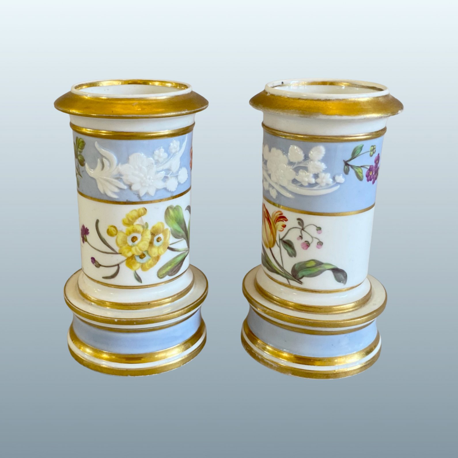 A FINE PAIR OF SPODE BOTANICAL SPILL VASES. Pattern No. 2004, circa 1815. A finely matched pair of early 19th-century English porcelain spill vases of elegant cylindrical form. Each vase is decorated with delicately applied gilt bands framing alternating zones of pale powder blue and white ground. The blue-ground reserves are richly painted with vibrant, naturalistic flower sprays, alternating with raised (relief)) white floral motifs. The botanical decoration demonstrates Spode’s characteristic precision and artistry, with carefully observed blooms rendered in bright enamels. Originally intended for holding spills—slender sticks used to transfer flame for lighting candles or lamps—these vases exemplify both the decorative and practical sophistication of early 19th-century domestic objects.