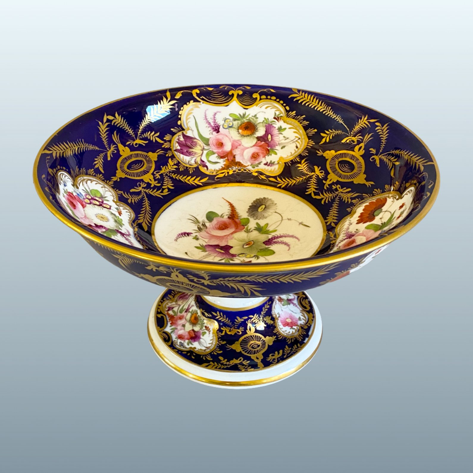 An elegant and finely proportioned centrepiece, the deep circular bowl raised on a pedestal issuing from a spreading foot. Intended as the focal element of a dessert service, such pieces would have been used to display fruit, sweetmeats, or ornamental arrangements on the dining table.