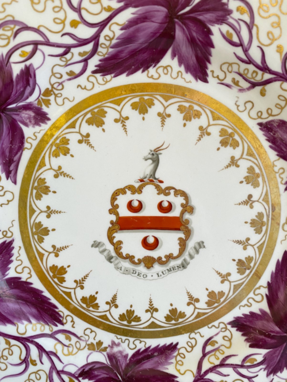 A BARR FLIGHT & BARR WORCESTER PORCELAIN ARMORIAL DESSERT PLATE, CIRCA 1820. A finely decorated Regency-period dessert plate, the centre painted in full colour with an heraldic armorial bearing, complete with motto beneath within a scrolling banner reading “A Deo Lumen” (“Light from God”). The armorial is enclosed within a gilt-edged roundel, further enriched by a continuous band of finely executed neoclassical gilt ornament.