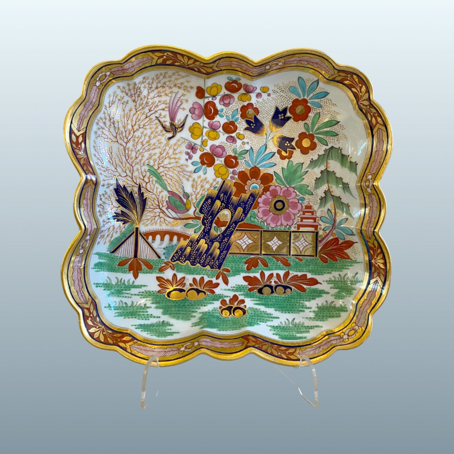 A superb and highly decorative Regency-period dessert dish of scalloped square form, richly ornamented in the celebrated Imari “Fence” pattern. The surface is vividly painted in bright enamels and heightened with gilding, depicting an elaborate garden landscape featuring a pagoda, ornamental fence, leaning rockwork, and a bridge, animated by exotic birds.