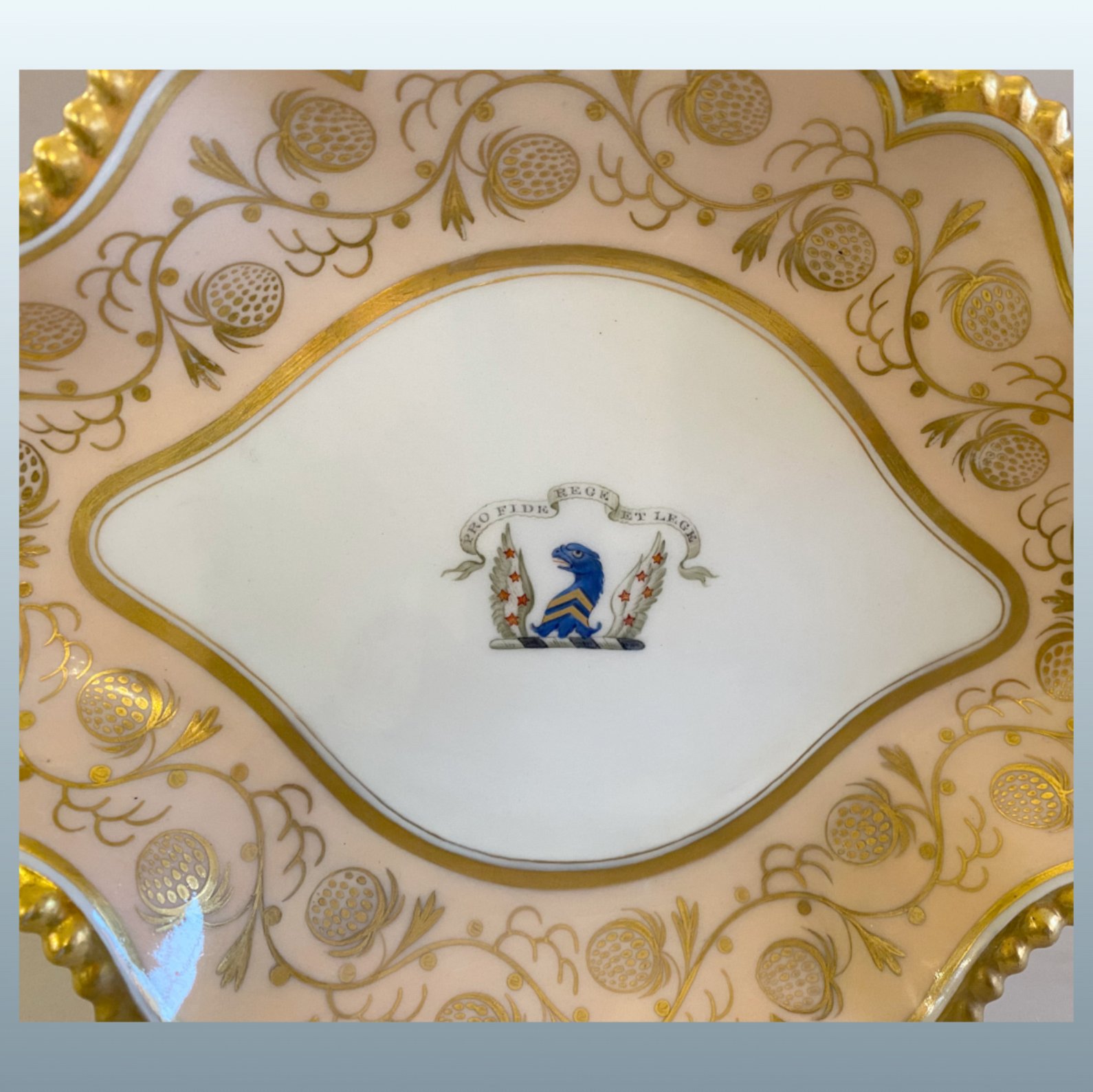 Circa 1813–1819. Of elegant oval scalloped form, the rim crisply moulded with a gadrooned border and richly heightened in burnished gilding, the well superbly decorated in polychrome enamels with a heraldic crest surmounted by a scrolling banner and inscribed with the motto “Pro Vide Reg et Lege” (“For King, law and the people”), and enclosed by a broad pale salmon ground border, finely embellished with trailing gilt strawberry vines, the gilding of notably high quality and typical of the refined output of the factory during this period. Impressed factory mark to the underside. 12inx9in