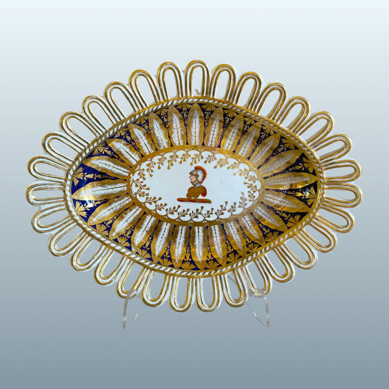 Of distinctive oval lozenge form, the rim with an elegant looped and pierced border, the centre painted in full colour with a heraldic crest depicting an armoured figure. This is enclosed within a deep cobalt-blue ground, richly decorated with a broad band of stylised foliage, finely tooled in gold. Script mark to the underside: “Chamberlains Worcester No. 126.”    11in x 8.5in