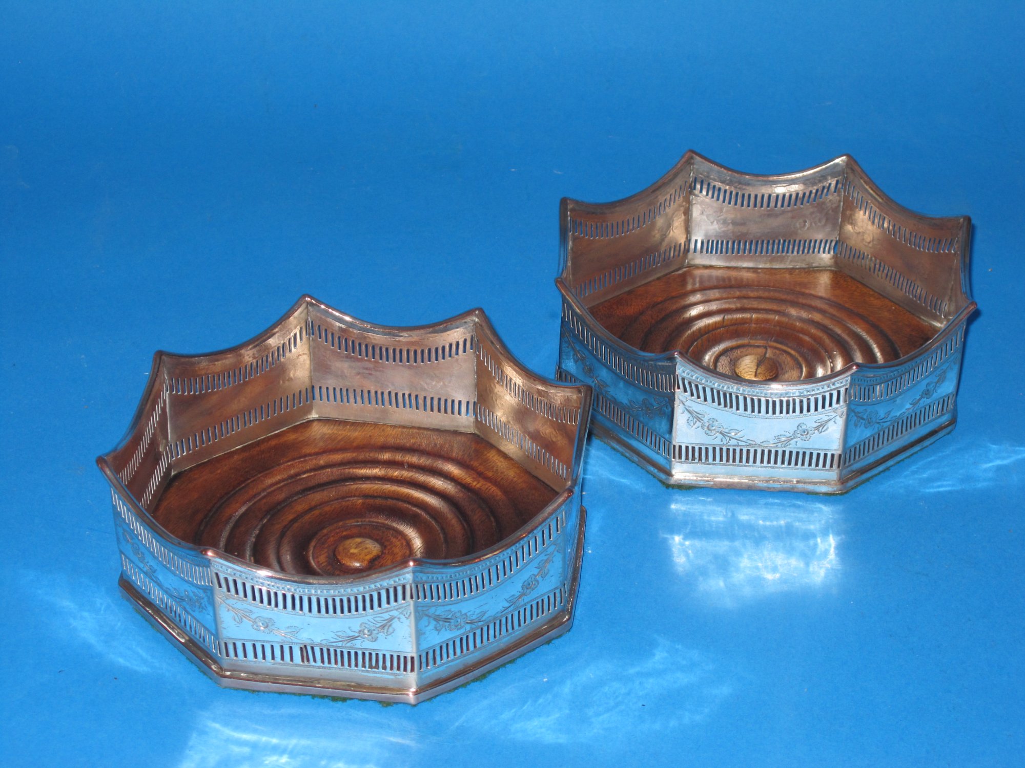Description: A rare pair of Old Sheffield Plate silver wine coasters of octagonal scalloped shape, with pierced & brightcut swag decoration. George III circa 1775
