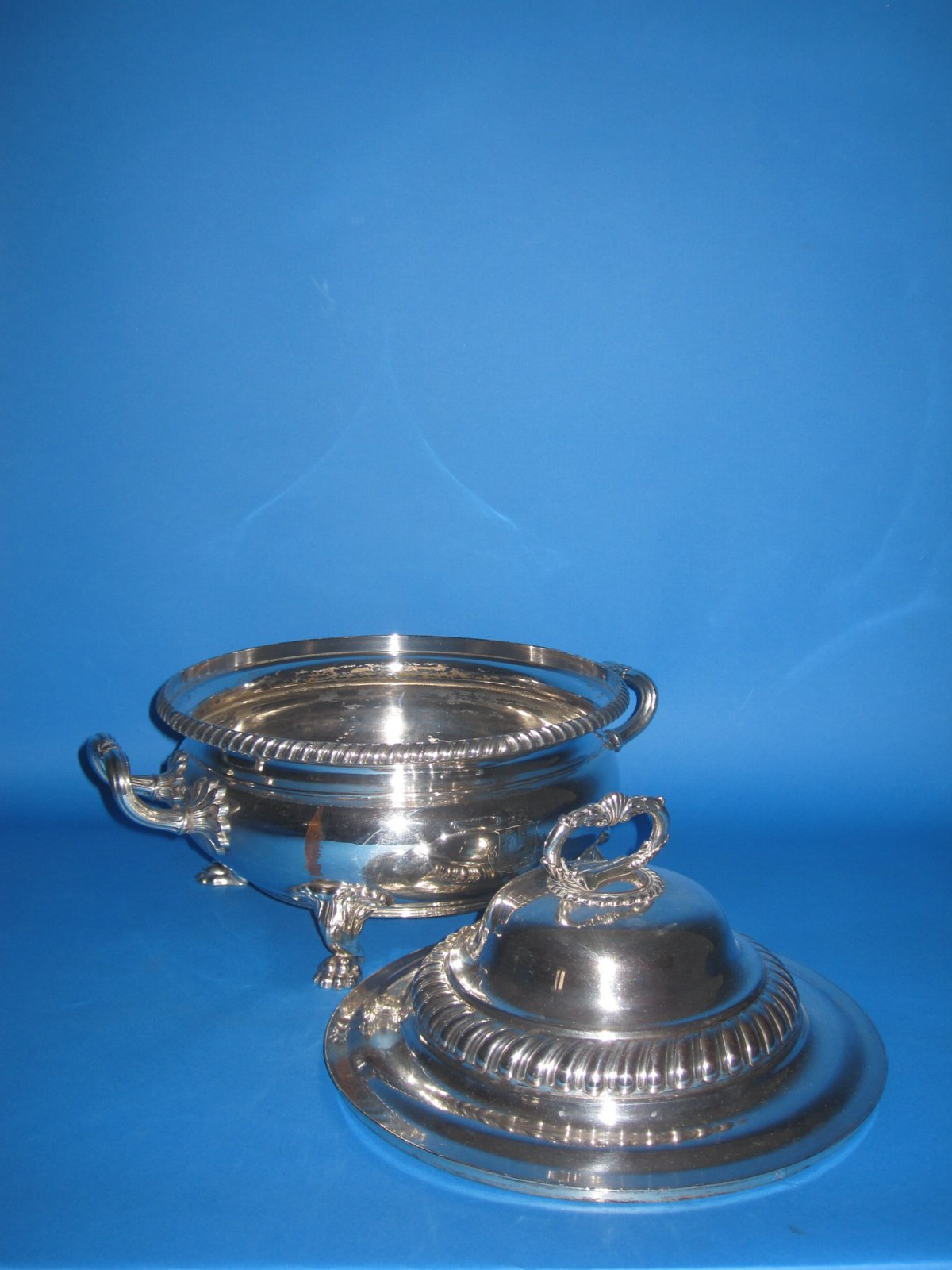 Of round form, having a domed gadrooend cover over a two handled round & bellied body, and raised on four scrolled lions paw feet.Engraved armorial with the motto "per angusta ad augusta" Through danger to Honour.