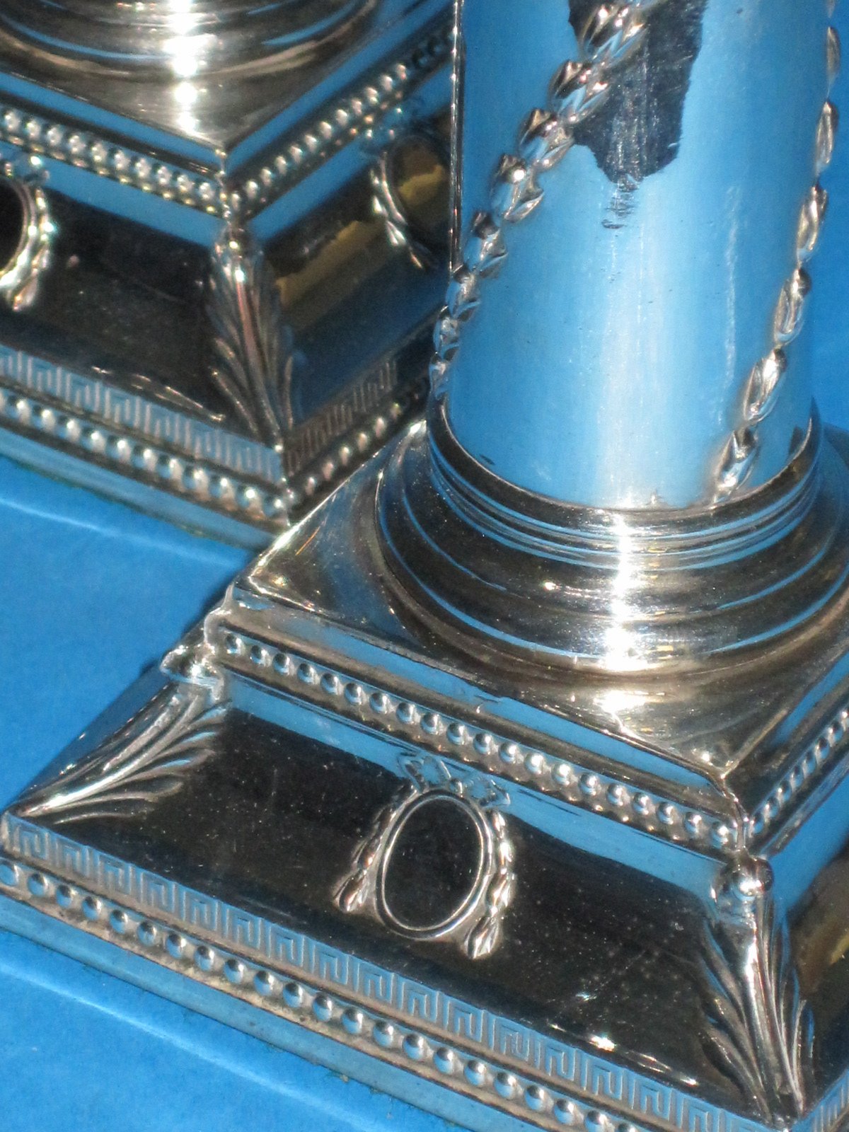 Description: A Pair Old Sheffield Plate Silver Dwarf or Bracket Candlesticks. George III, circa 1775. Each of square based form with beaded mounts ribbon & swagged medallions, and twisted harebell & swagged columns. Height: 5 inches.
