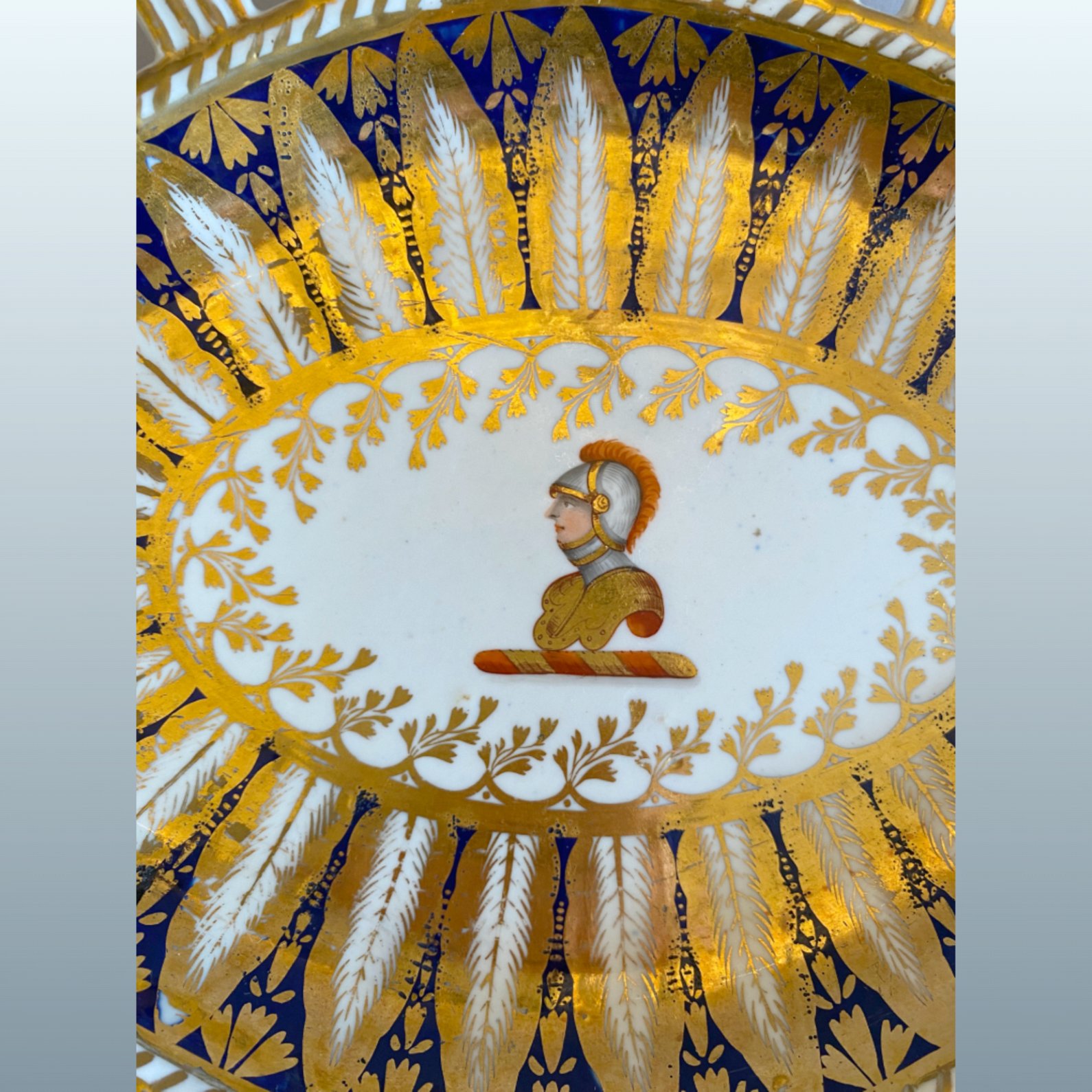 Of distinctive oval lozenge form, the rim with an elegant looped and pierced border, the centre painted in full colour with a heraldic crest depicting an armoured figure. This is enclosed within a deep cobalt-blue ground, richly decorated with a broad band of stylised foliage, finely tooled in gold. Script mark to the underside: “Chamberlains Worcester No. 126.” 11in x 8.5in
