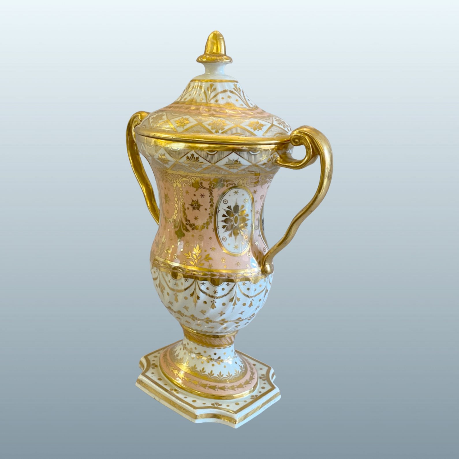 Of highly sophisticated conception, this vase and cover represents an ambitious early production of the Chamberlain’s Worcester factory The vessel is of spiral-fluted (or “shanked”) baluster form, rising to a waisted neck and fitted with a domed cover surmounted by a gilt acorn finial. The body is applied with elegant, upswept handles, and the whole is raised on a circular foot set upon a shaped oblong plinth base. The decorative scheme is executed with notable refinement. Extensive gilding, of a high technical standard, comprises lozenge diapering, pendant harebells, anthemion-derived motifs, classical swags, and star devices, all disposed with careful symmetry. A broad central band in pale salmon pink serves as the principal ground for the figural reserve. The reverse is ornamented with alternating gilt and white oval panels on the same ground, while a subsidiary lower register continues the neoclassical vocabulary upon a white ground.