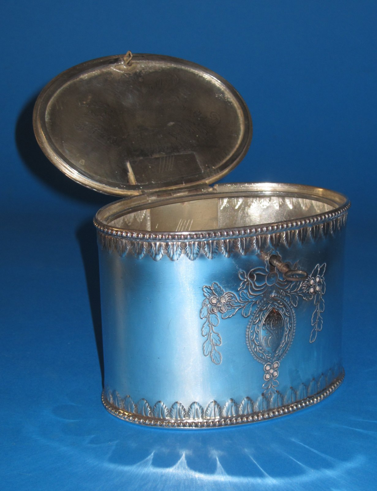 Description: A good late 18th Century Old Sheffield Plate tea caddy. Of oval flat sided form with hinged lid, having beaded borders and chased engraved decoration. Lock & key to front. George III, Circa 1790