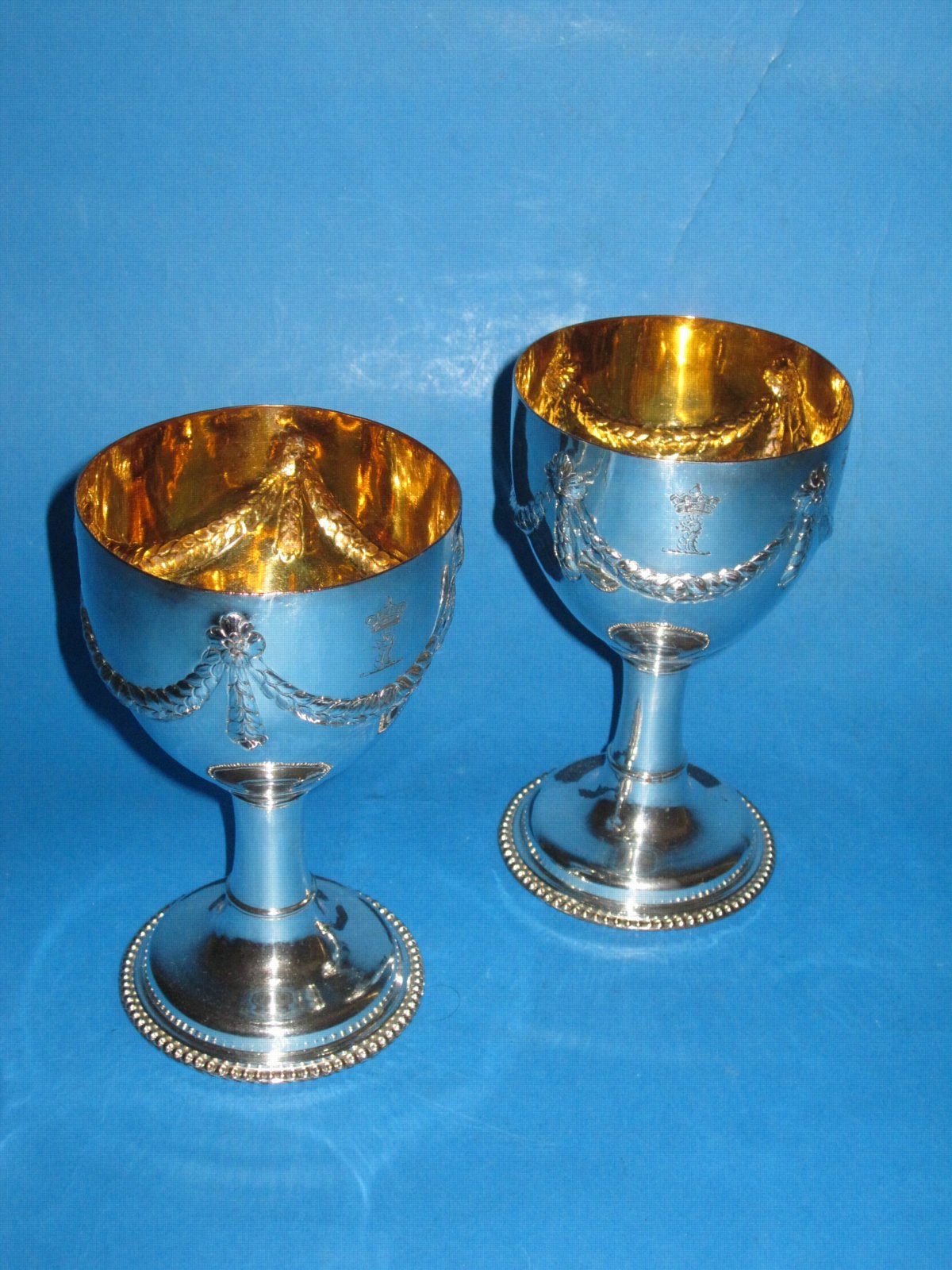 Description: A Fine pair of George III Old Sheffield Plate Silver Goblets, circa 1790. Each with garland swagged body with gilded interiors, engraved crest, and raised on a circular beaded foot. Illustrated in Gordon Crosskey, page 286, fig 348.