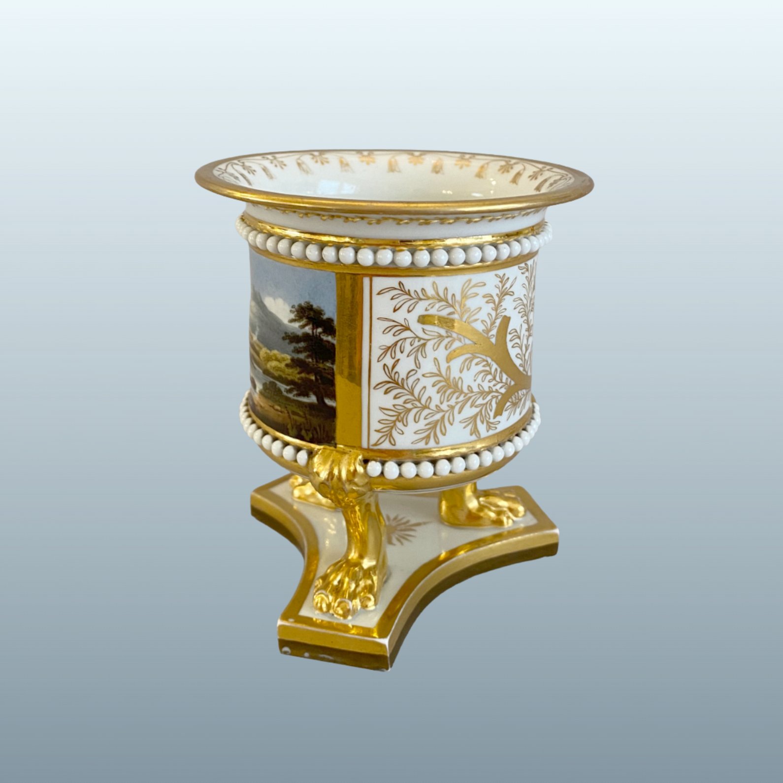The cylindrical body with white pearl collars & rasied on three gilded lions legs upon a triform base. Finely painted with a named scene to the front "A View of Derwentwater in Cumberland" of figures in a boat upon the lake with the mountains in the distance.