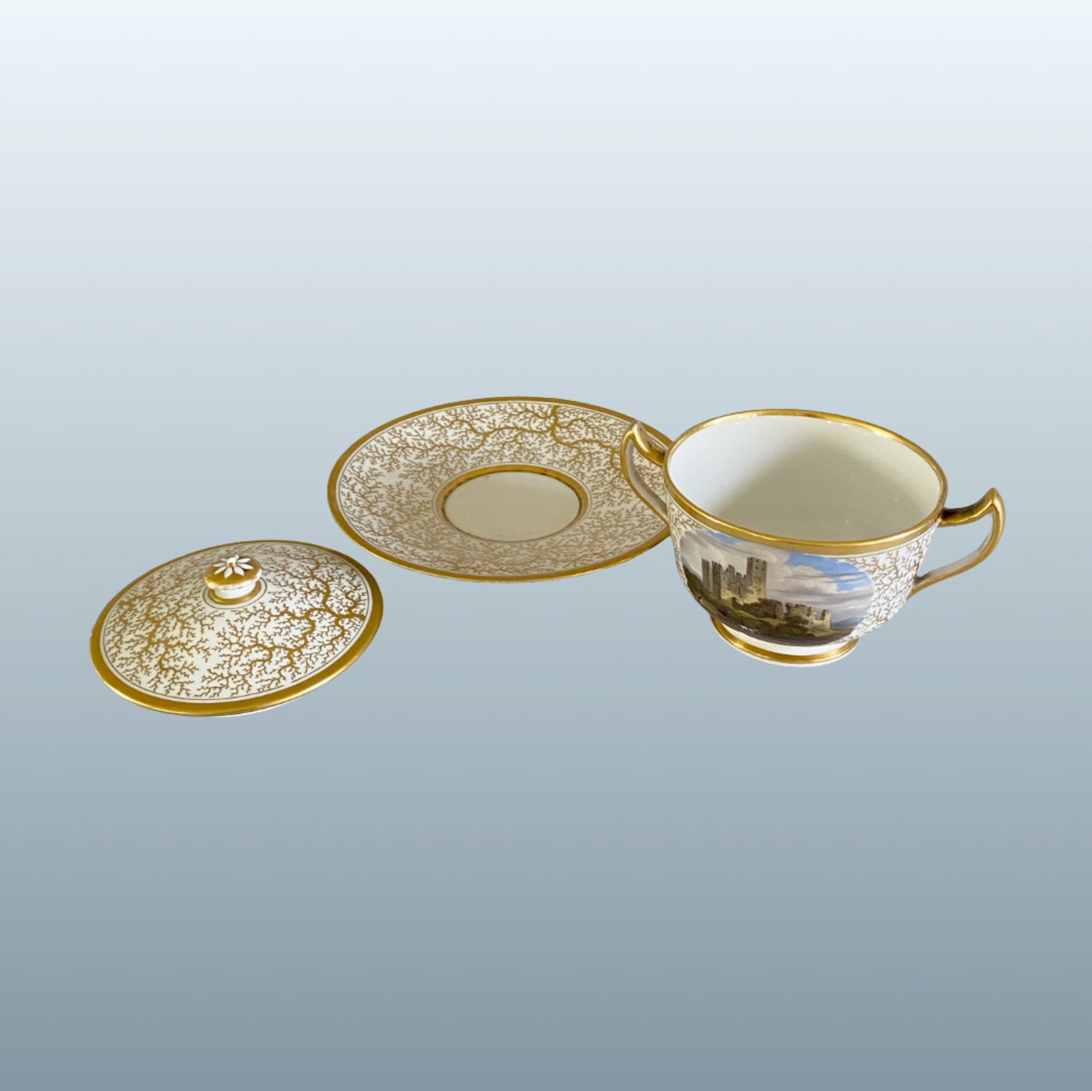 A FINE FLIGHT BARR & BARR WORCESTER PORCELAIN TWO HANDLED CUP, COVER AND STAND. CIRCA 1820. The cup beautifully painted with a named scene of Bothal Castle, Northumberland reserved upon a continuous seaweed gilt pattern, which is continued on the cover and stand and bordered with gilt bands. Makers impressed mark & in red script: Flight Barr & Barr, Royal Porcelain Works Worcester- London House, No:1 Coventry St. Height: 3.75 inches